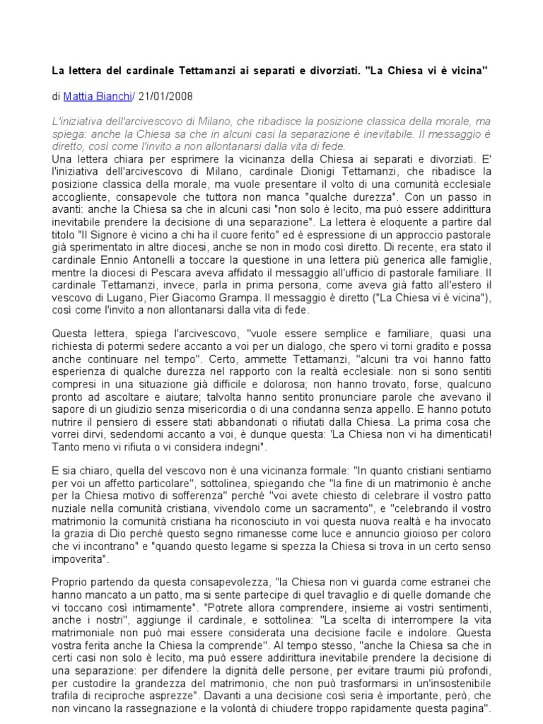 La Lettera Del Cardinale Tettamanzi Ai Separati e Divorziati