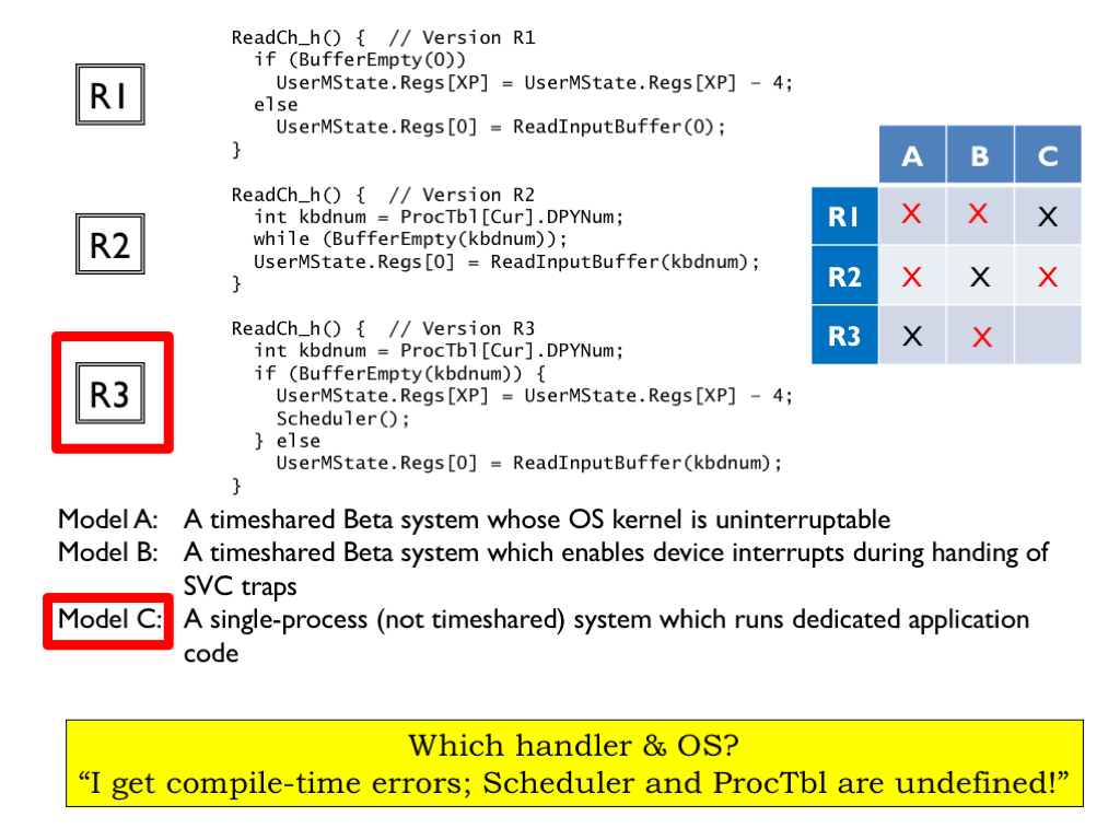 Here’s an old quiz problem we can use to test our understanding of all the factors that went into the final design of our ReadKey() SVC code. We’re considering three different versions (R1, R2, and R3) of the ReadKey() SVC code, all variants of the various attempts from the previous section. And there are three types of systems (Models A, B, and C). We’ve been asked to match the three handlers to the appropriate system.