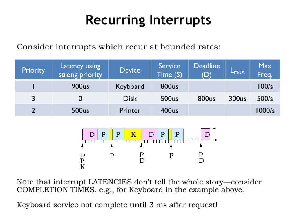 The maximum latency before a keyboard requests starts is indeed 900 us. But that doesn’t tell the whole story! As you can see, the poor keyboard handler is continually preempted by higher-priority disk and printer requests and so the keyboard handler doesn’t complete until 3 ms after its request was received! This illustrates why real-time constraints are best expressed in terms of deadlines and not latencies.