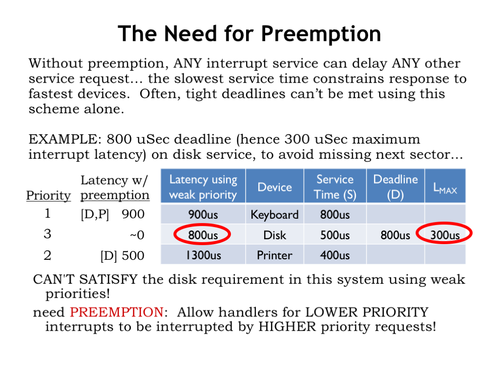 We need to introduce a preemptive priority system that allows lower-priority handlers to be interrupted by higher-priority requests. We’ll refer to this as a “strong” priority system. Suppose we gave the disk the highest priority, the printer second priority, and keyboard the lowest priority, just like we did before.