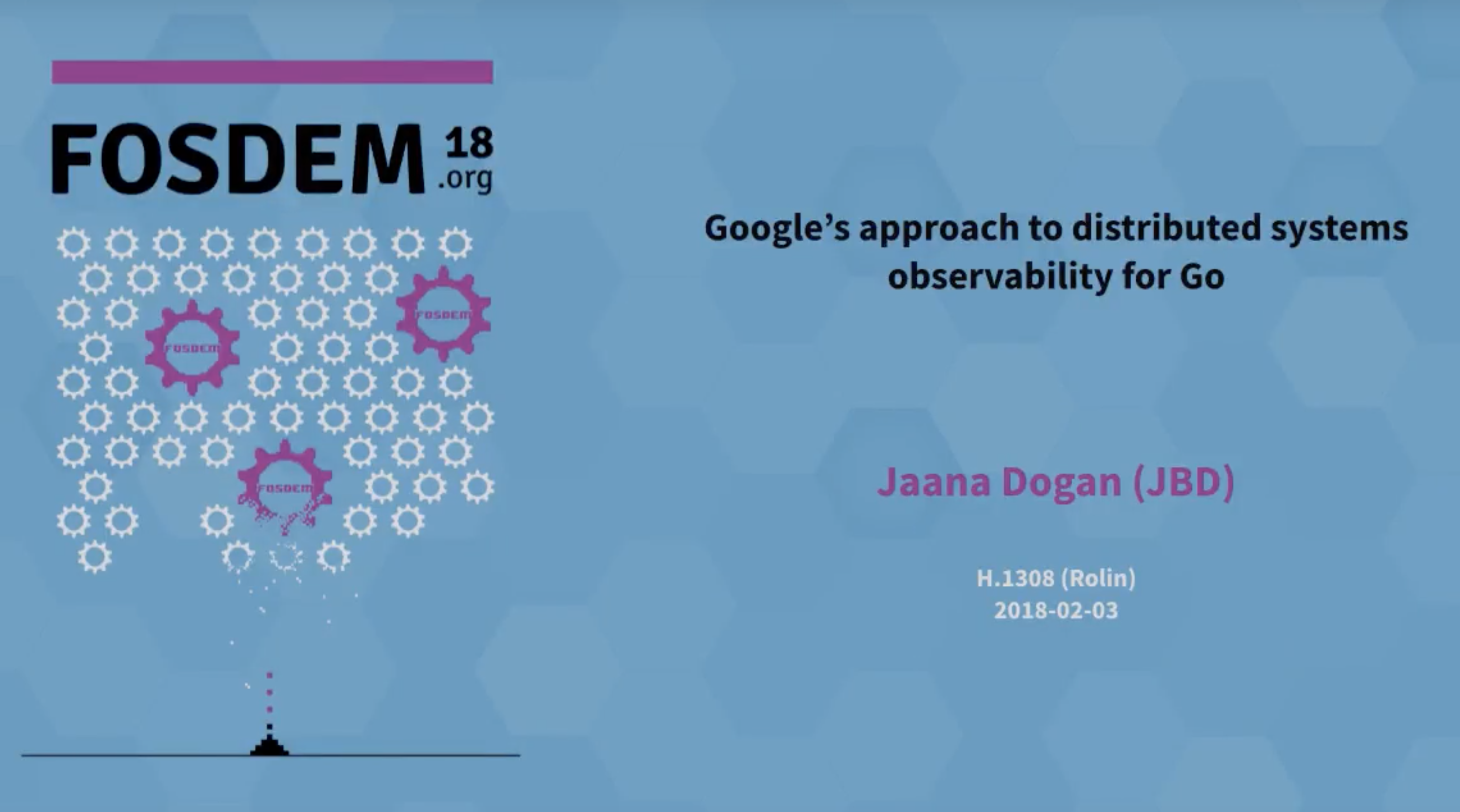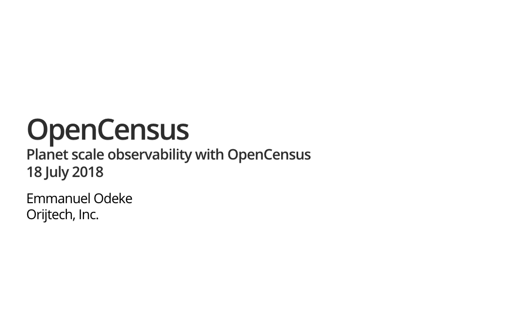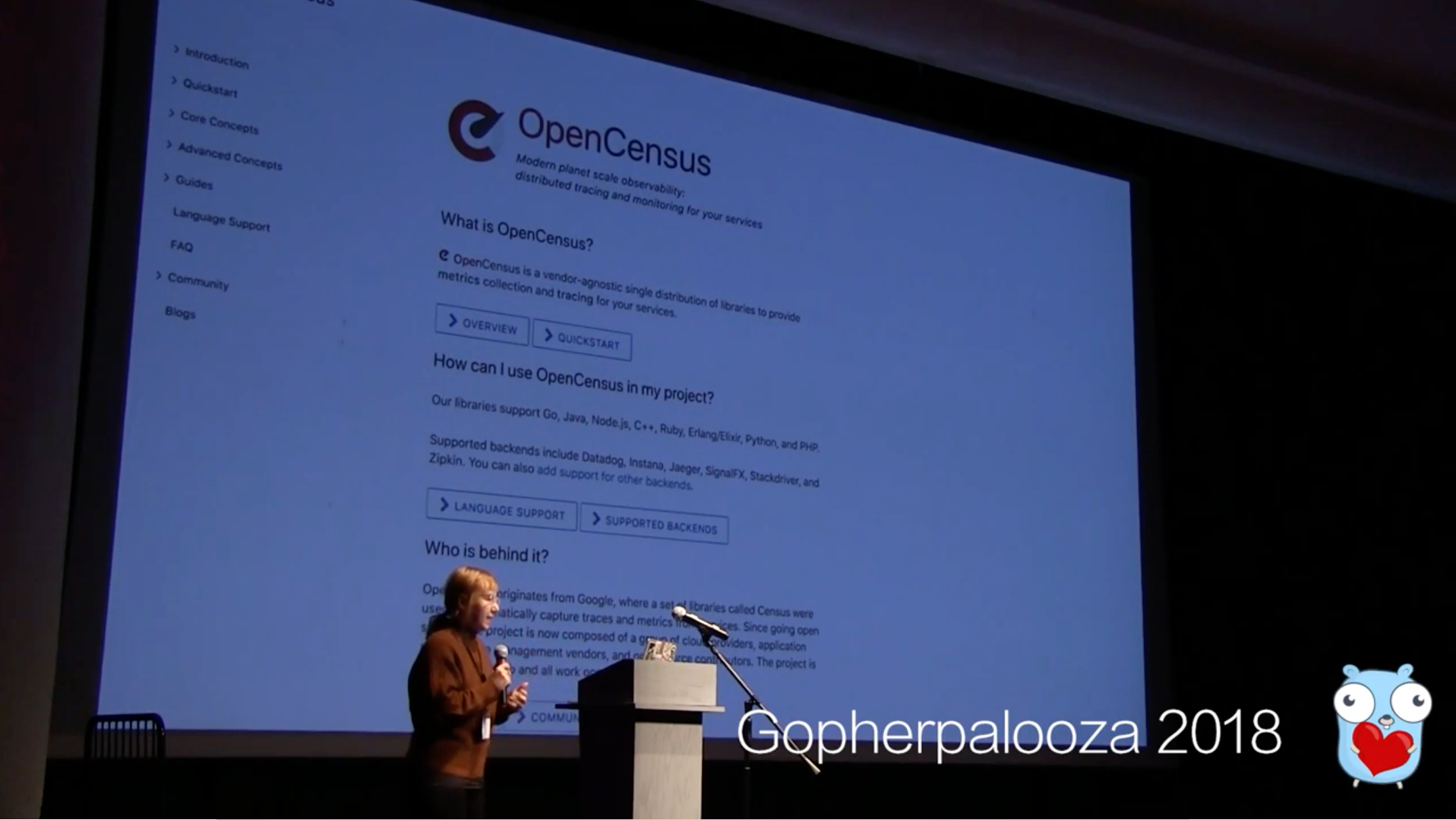 OpenCensus is being archived! Read the blog post to learn more Navigation : Introduction Quickstart Tracing Tags Stats/Metrics Exporters zPages Service Advanced Concepts Guides Language Support Integrations FAQ Feature Matrix Code of Conduct Community - Roadmap - Reporting issues - Talks - Users Blogs Articles Codelabs Talks Some of the publicly known OpenCensus talks: Kelsey Hightower at Gophercon 2018 Cloud Memorystore for Redis * OpenCensus Morgan McLean at Google Next 2018 SF Jaana Burcu Dogan at Gopherpalooza 2018 Morgan McLean Google Cloud on Air Jay Judkowitz at Google Next 2018 SF Emmanuel Odeke at GoSF 2018 Emil Mikulic at SRECon 2018 Asia/Australia Iliia Khaprov - Code BEAM STO 2018 Jaana Dogan at FOSDEM 2018 Sandeep Dinesh - Istio and OpenCensus at DevFestDC 2018 Morgan McLean, Varun Talawar: Istio and OpenCensus Jaana Dogan gRPC community meeting Google Developers OpenCensus announcement Reporting issues Users