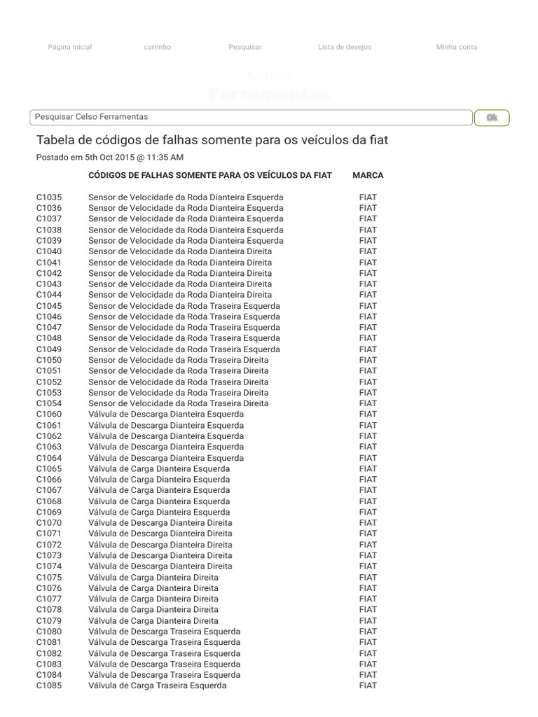 Tabela de códigos de falhas somente para os veículos da fiat
