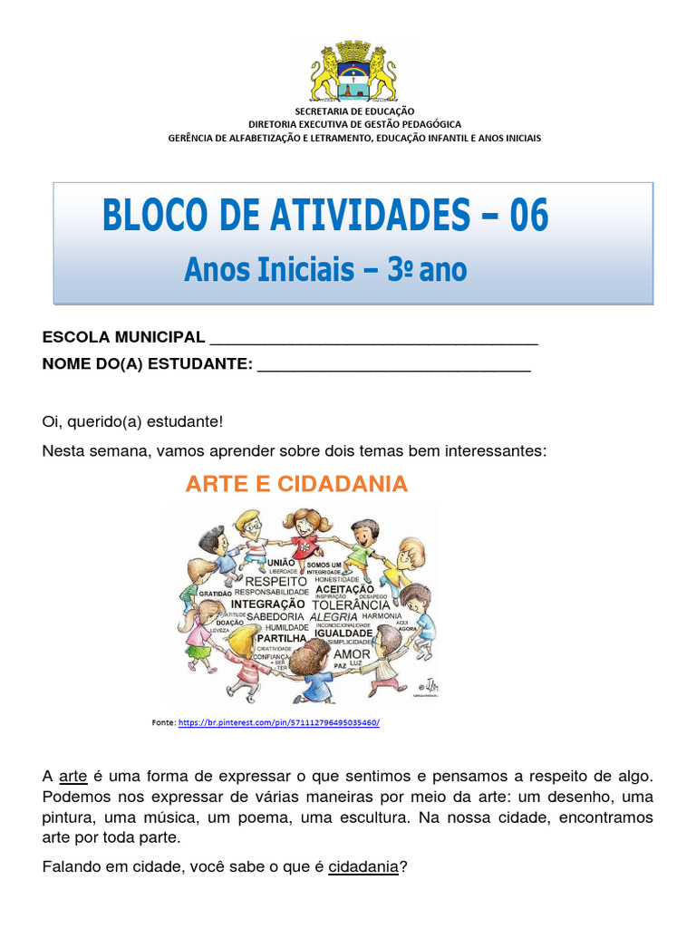 Bloco de Atividades6 - 3º Ano - Arte e Cidadania