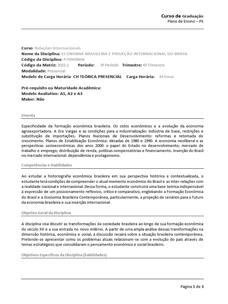 O plano de ensino da disciplina 'Economia Brasileira e Projeção Internacional do Brasil' aborda a formação econômica brasileira, ciclos econômicos, industrialização e inserção internacional do Brasil. O objetivo é discutir transformações históricas e sociais, capacitando os alunos a refletirem criticamente sobre a economia contemporânea e suas desigualdades. A metodologia inclui aulas expositivas, discussões e avaliação processual através de atividades em grupo e provas.