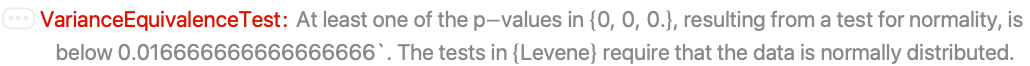 - VarianceEquivalenceTest[{data1,…},All] will choose all tests that apply to the data.