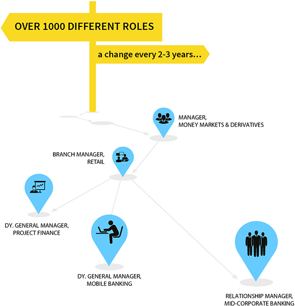You become part of a universal bank with over 1000 different roles across different businesses. This diversity of work ensures constant learning throughout your career. Job rotation every 2-3 years ensures that you get unparalleled exposure to a wide spectrum of industries and business functions. You may have a stint in SME lending as a Relationship Manager for a few years, lead a Retail Branch in your next role, and become a Dealer in Treasury thereafter. You may also get the opportunity to explore different financial services like insurance, investment banking, asset management, credit cards to name a few by working in one of the subsidiaries of the Bank. You gain exposure to different segments of people, geographies and products in each stint. The nature of engagement becomes more creative and intense as you progress.