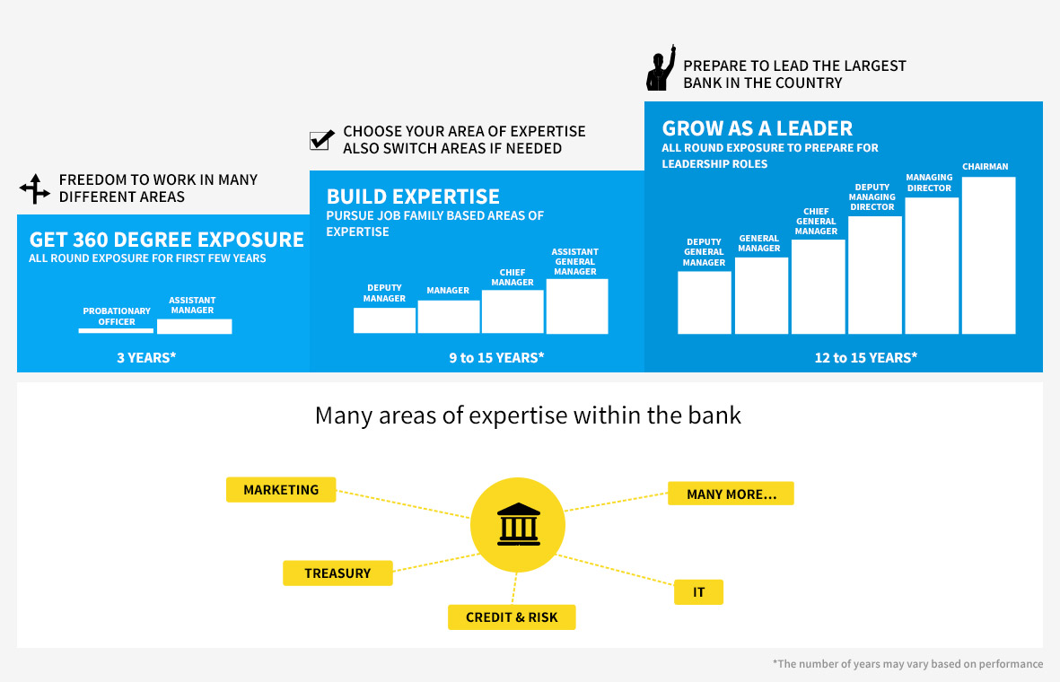 At SBI, each employee has a unique career path. You are initially groomed as an all-rounder, and thereafter you have the freedom to pursue your area of interest and build expertise. As you grow to senior levels, you develop as a leader by assuming critical positions across different businesses. Throughout your career, you are provided with elevation opportunities every 3-4 years based on performance.