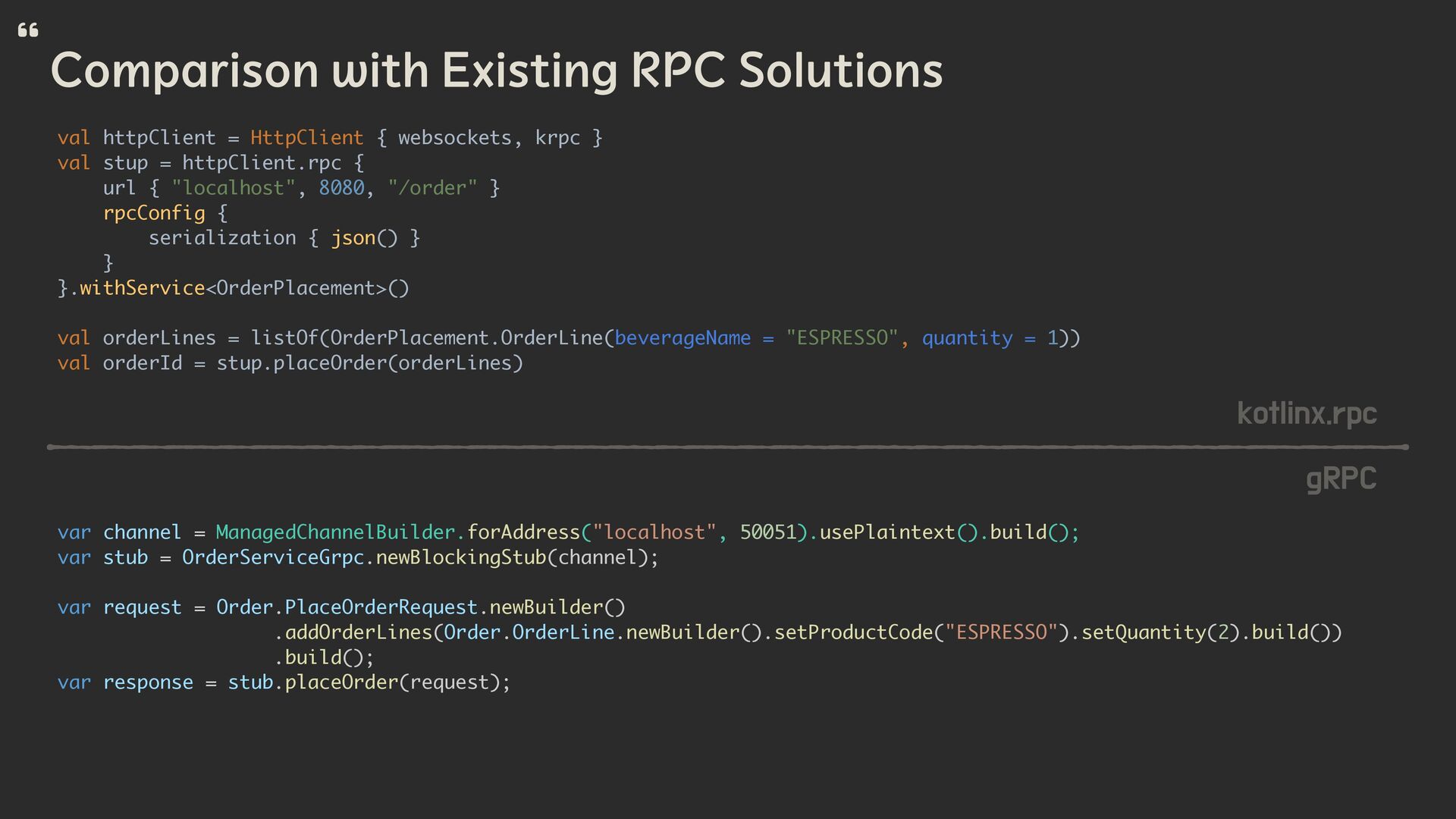 kotlinx.rpc is a multiplatform Kotlin library that provides its users with tools to perform Remote Procedure Calls using Kotlin language constructs with as easy setup as possible.