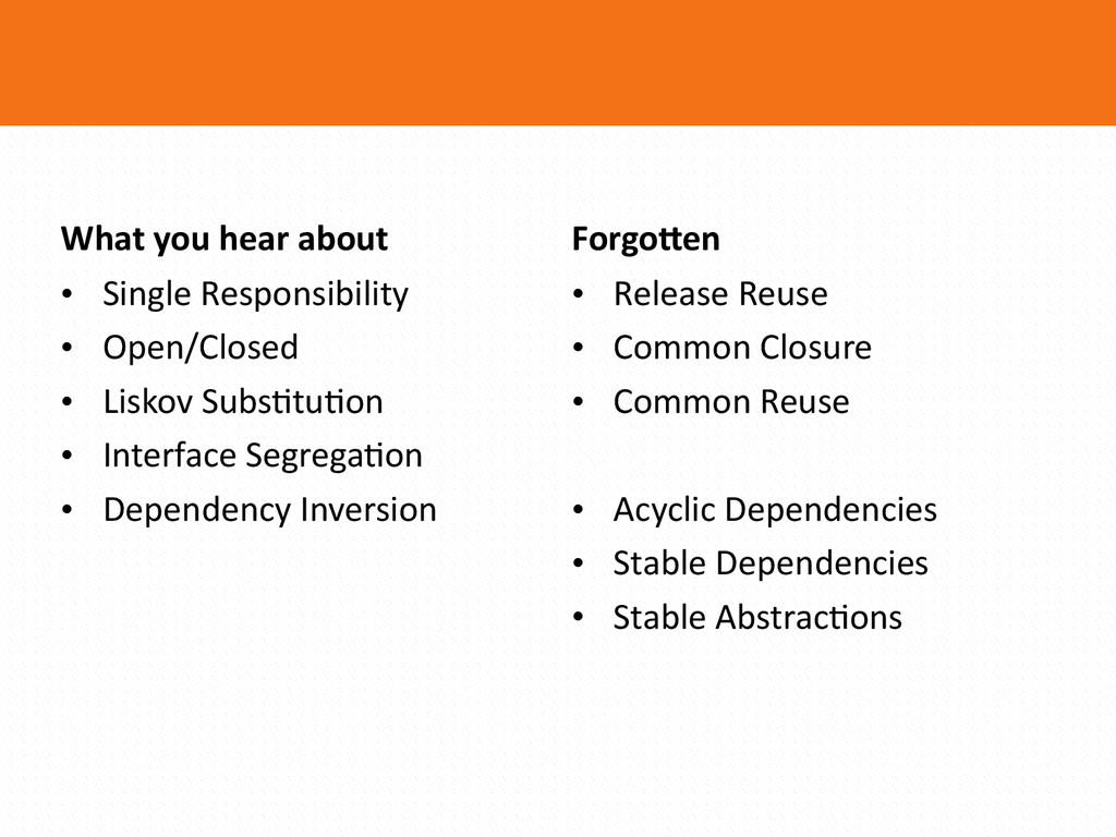 Reuse • Acyclic Dependencies • Stable Dependencies • Stable Abstrac2ons Forgo%en SOLID principals What you hear about • Single Responsibility • Open/Closed • Liskov Subs2tu2on • Interface Segrega2on • Dependency Inversion