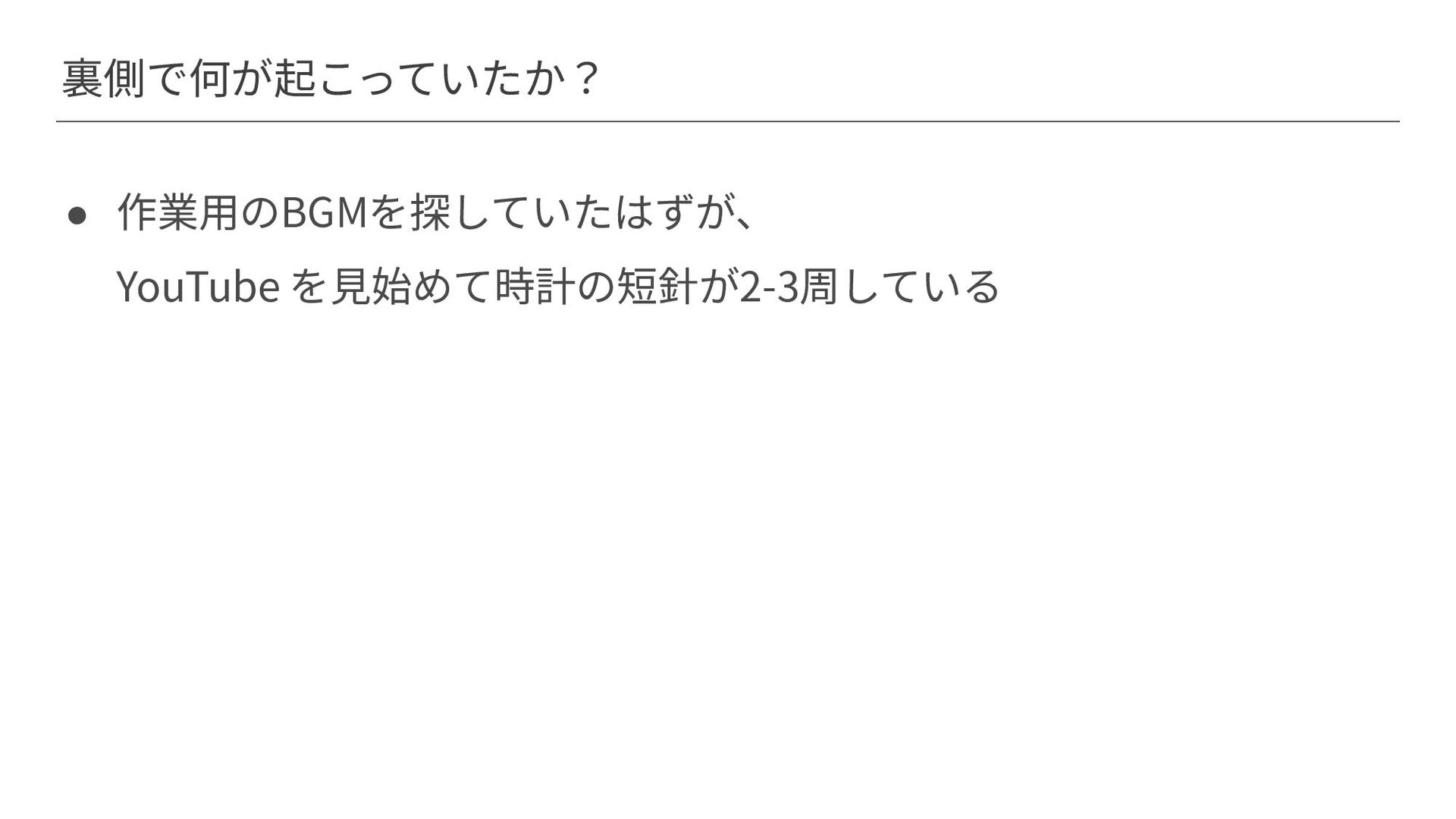 裏側で何が起こっていたか? • 作業⽤のBGMを探していたはずが、 YouTube を⾒始めて時計の短針が2-3周している