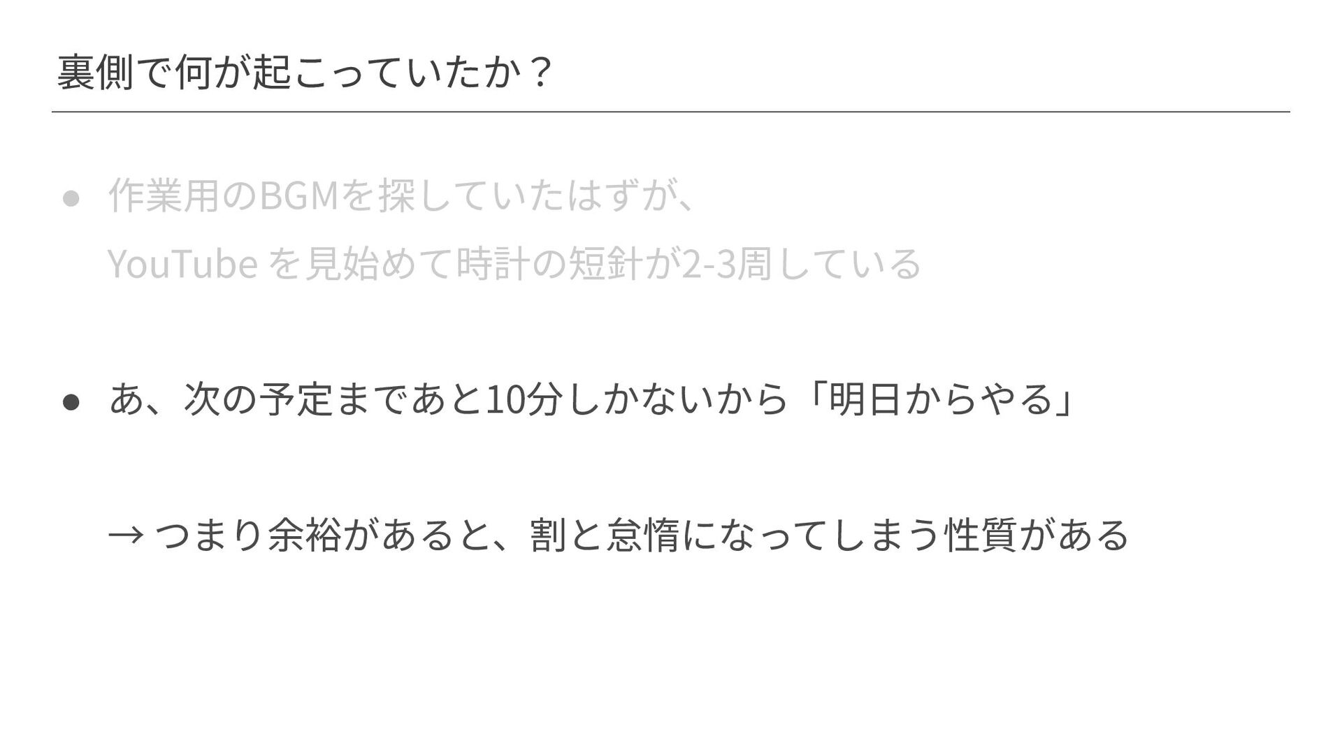 裏側で何が起こっていたか? • 作業⽤のBGMを探していたはずが、 YouTube を⾒始めて時計の短針が2-3周している • あ、次の予定まであと10分しかないから「明⽇からやる」 → つまり余裕があると、割と怠惰になってしまう性質がある