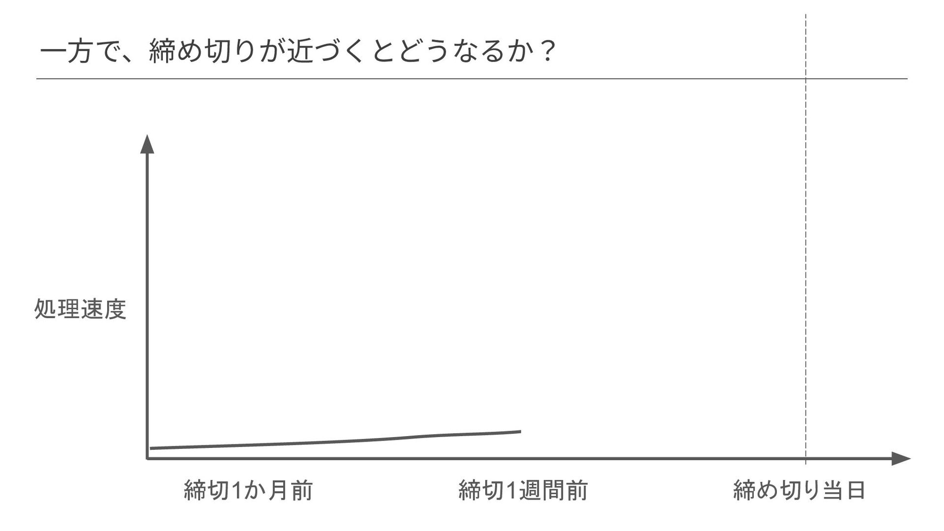 ⼀⽅で、締め切りが近づくとどうなるか? 処理速度 締め切り当日 締切1週間前 締切1か月前