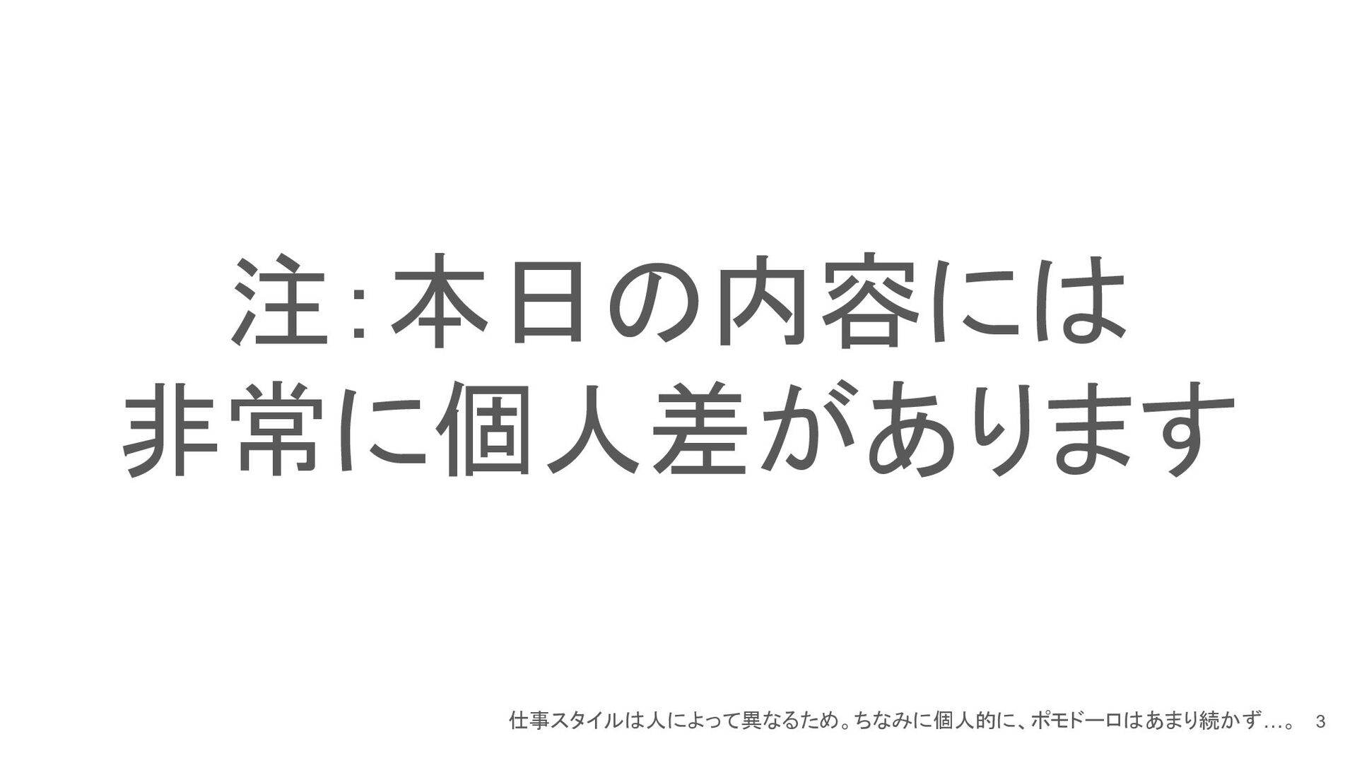 注:本日の内容には 非常に個人差があります 3 仕事スタイルは人によって異なるため。ちなみに個人的に、ポモドーロはあまり続かず…。