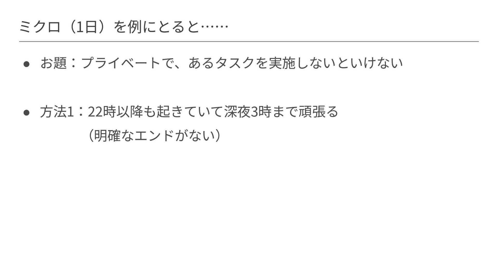 ミクロ(1⽇)を例にとると…… • お題:プライベートで、あるタスクを実施しないといけない • ⽅法1:22時以降も起きていて深夜3時まで頑張る (明確なエンドがない)