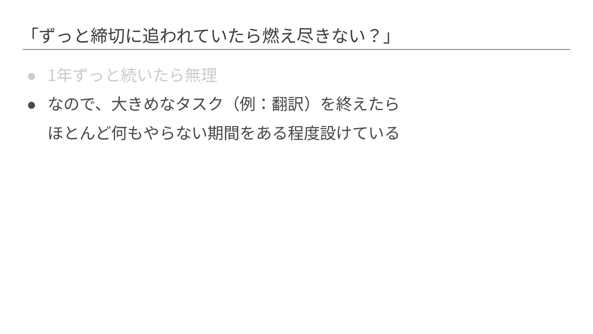 「ずっと締切に追われていたら燃え尽きない?」 • 1年ずっと続いたら無理 • なので、⼤きめなタスク(例:翻訳)を終えたら ほとんど何もやらない期間をある程度設けている