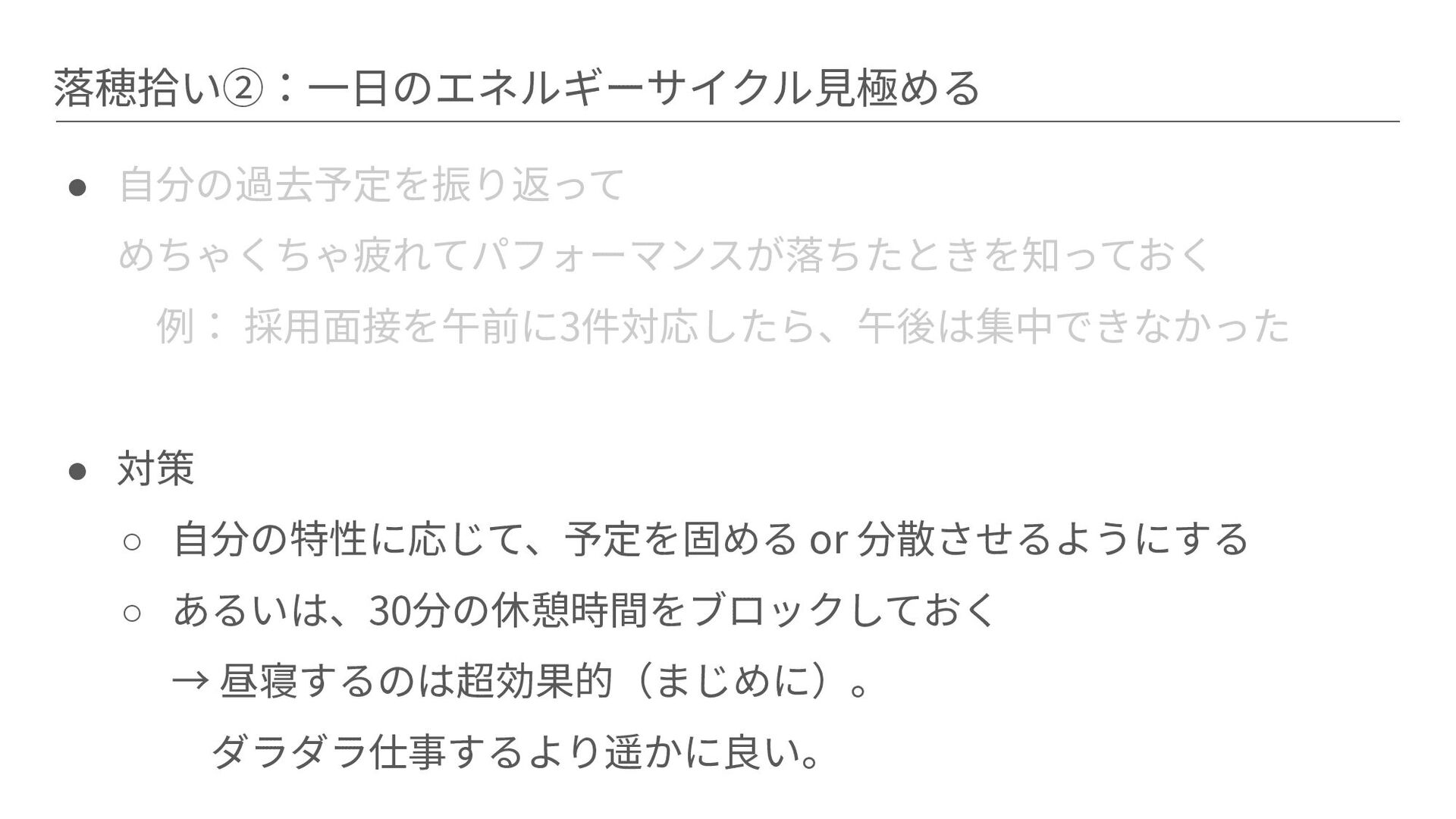 落穂拾い②:⼀⽇のエネルギーサイクル⾒極める • ⾃分の過去予定を振り返って めちゃくちゃ疲れてパフォーマンスが落ちたときを知っておく 例: 採⽤⾯接を午前に3件対応したら、午後は集中できなかった • 対策 ◦ ⾃分の特性に応じて、予定を固める
