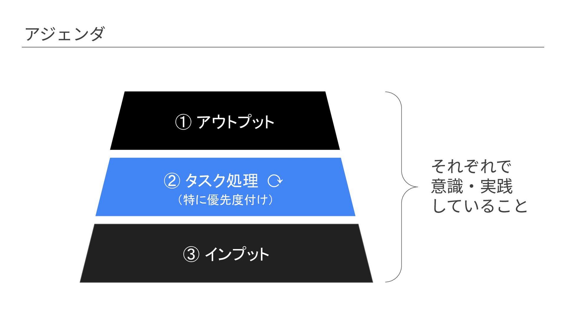 アジェンダ ③ インプット ② タスク処理 ⟳ (特に優先度付け) ① アウトプット それぞれで