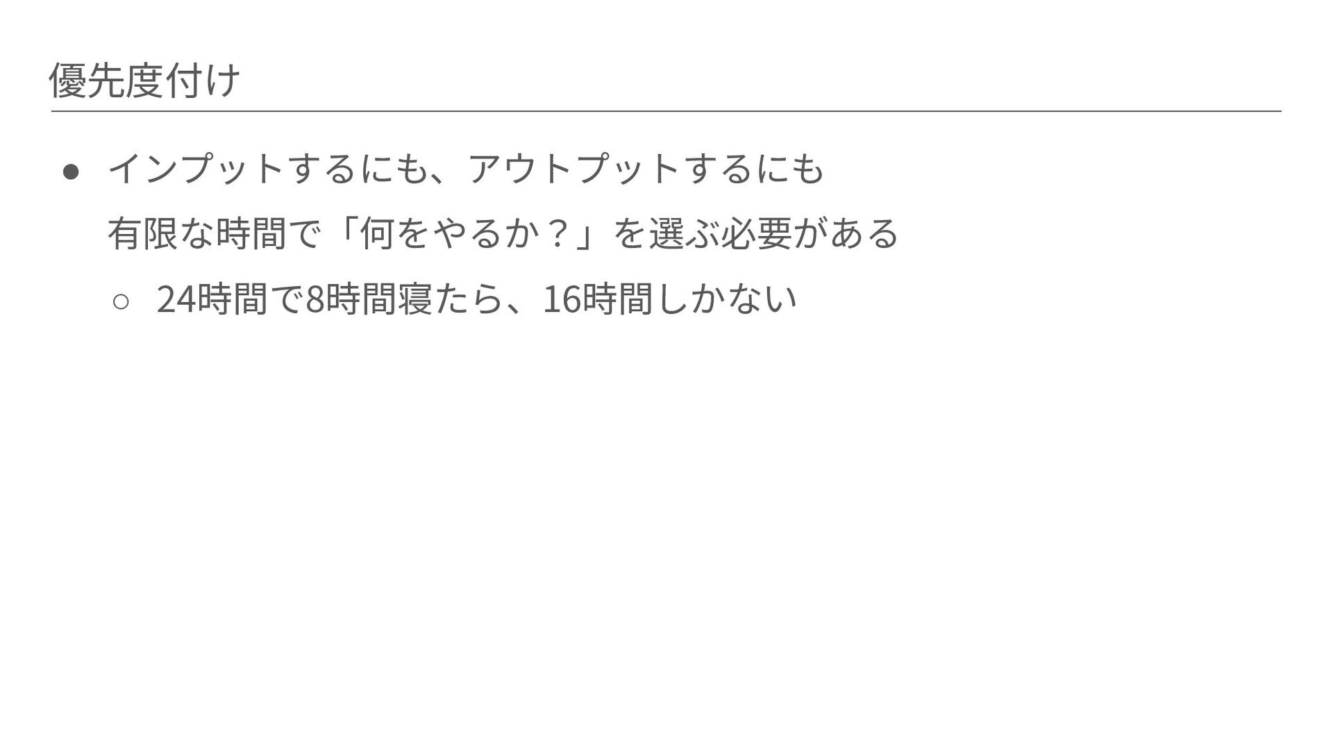 優先度付け • インプットするにも、アウトプットするにも 有限な時間で「何をやるか?」を選ぶ必要がある ◦ 24時間で8時間寝たら、16時間しかない
