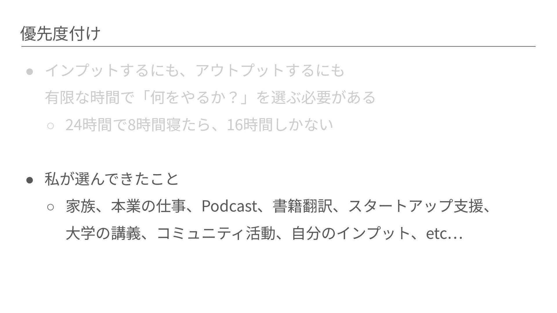 優先度付け • インプットするにも、アウトプットするにも 有限な時間で「何をやるか?」を選ぶ必要がある ◦ 24時間で8時間寝たら、16時間しかない • 私が選んできたこと ◦ 家族、本業の仕事、Podcast、書籍翻訳、スタートアップ⽀援、