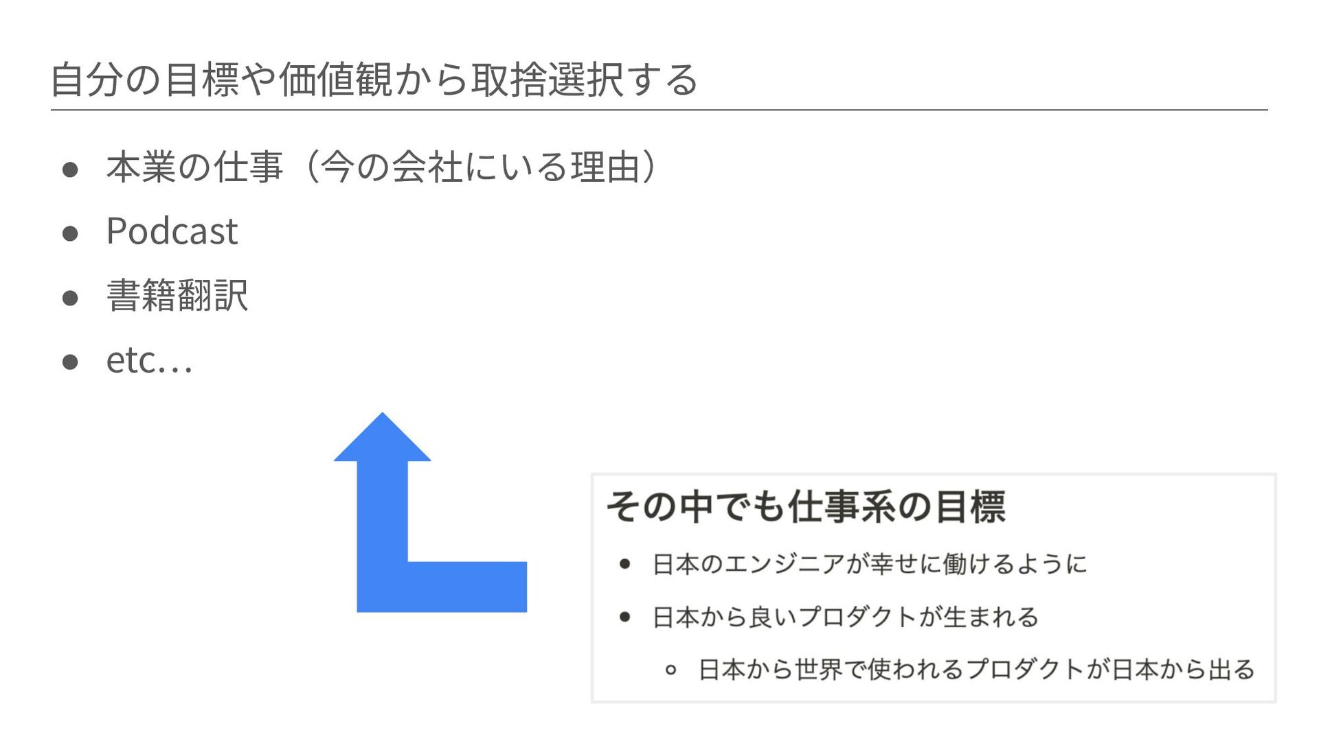 ⾃分の⽬標や価値観から取捨選択する • 本業の仕事(今の会社にいる理由) • Podcast • 書籍翻訳 • etc…