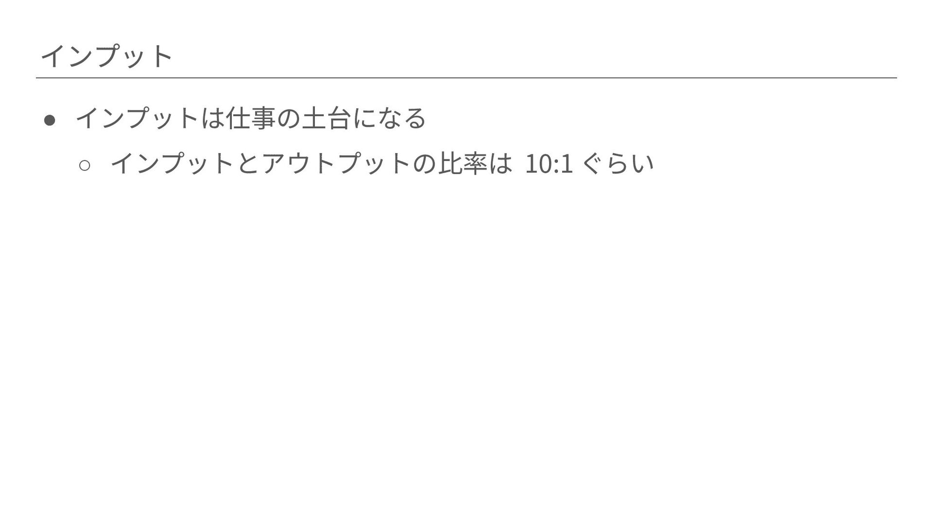インプット • インプットは仕事の⼟台になる ◦ インプットとアウトプットの⽐率は 10:1 ぐらい