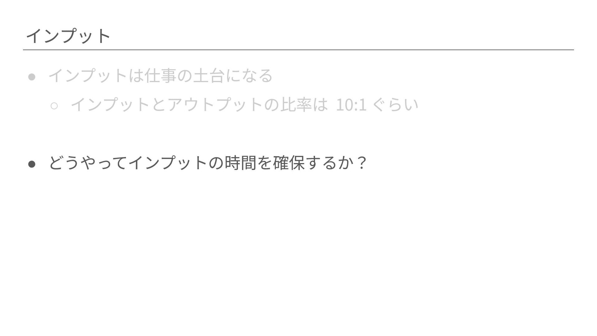 インプット • インプットは仕事の⼟台になる ◦ インプットとアウトプットの⽐率は 10:1 ぐらい • どうやってインプットの時間を確保するか? →