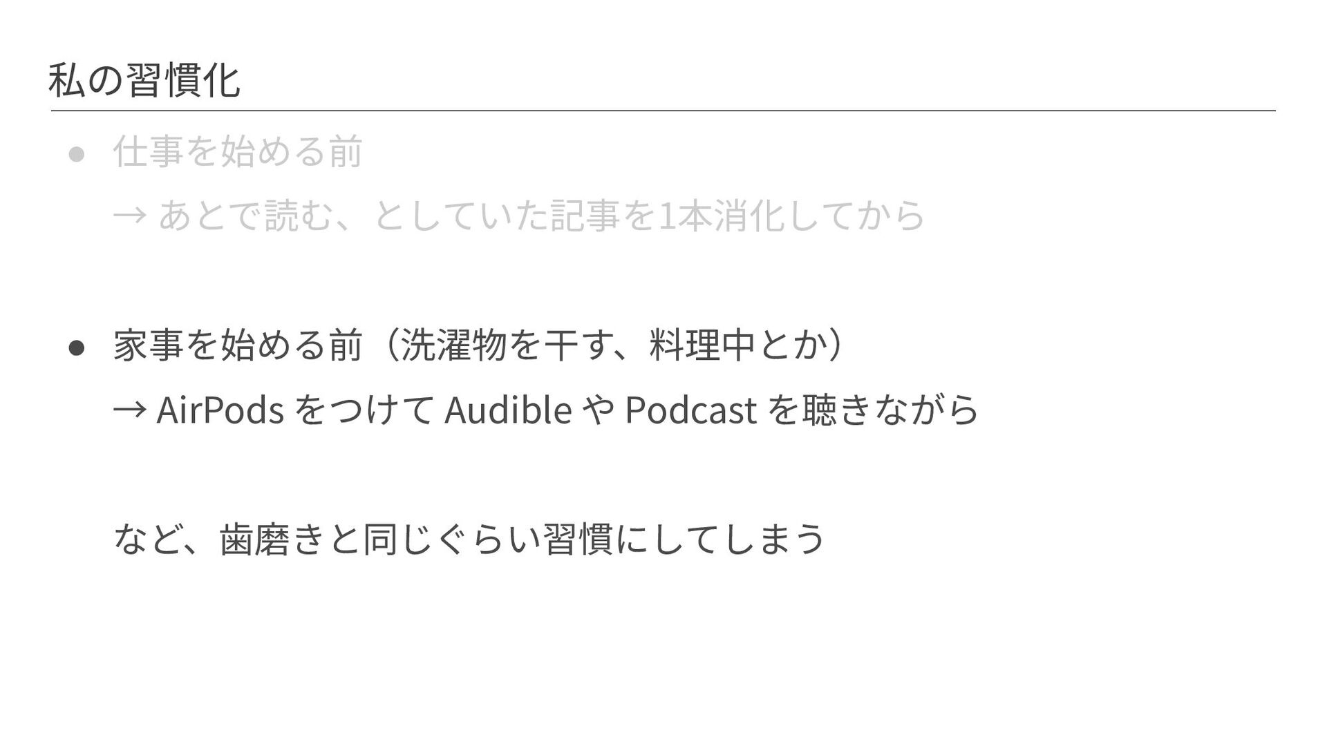 私の習慣化 • 仕事を始める前 → あとで読む、としていた記事を1本消化してから • 家事を始める前(洗濯物を⼲す、料理中とか) → AirPods をつけて