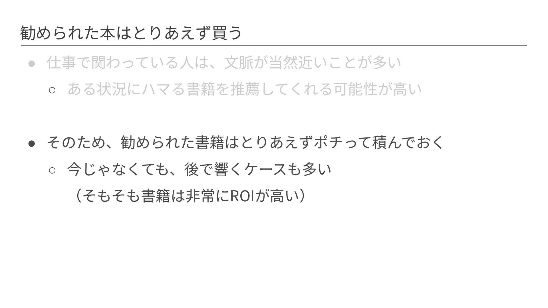 勧められた本はとりあえず買う • 仕事で関わっている⼈は、⽂脈が当然近いことが多い ◦ ある状況にハマる書籍を推薦してくれる可能性が⾼い • そのため、勧められた書籍はとりあえずポチって積んでおく ◦ 今じゃなくても、後で響くケースも多い (そもそも書籍は⾮常にROIが⾼い)