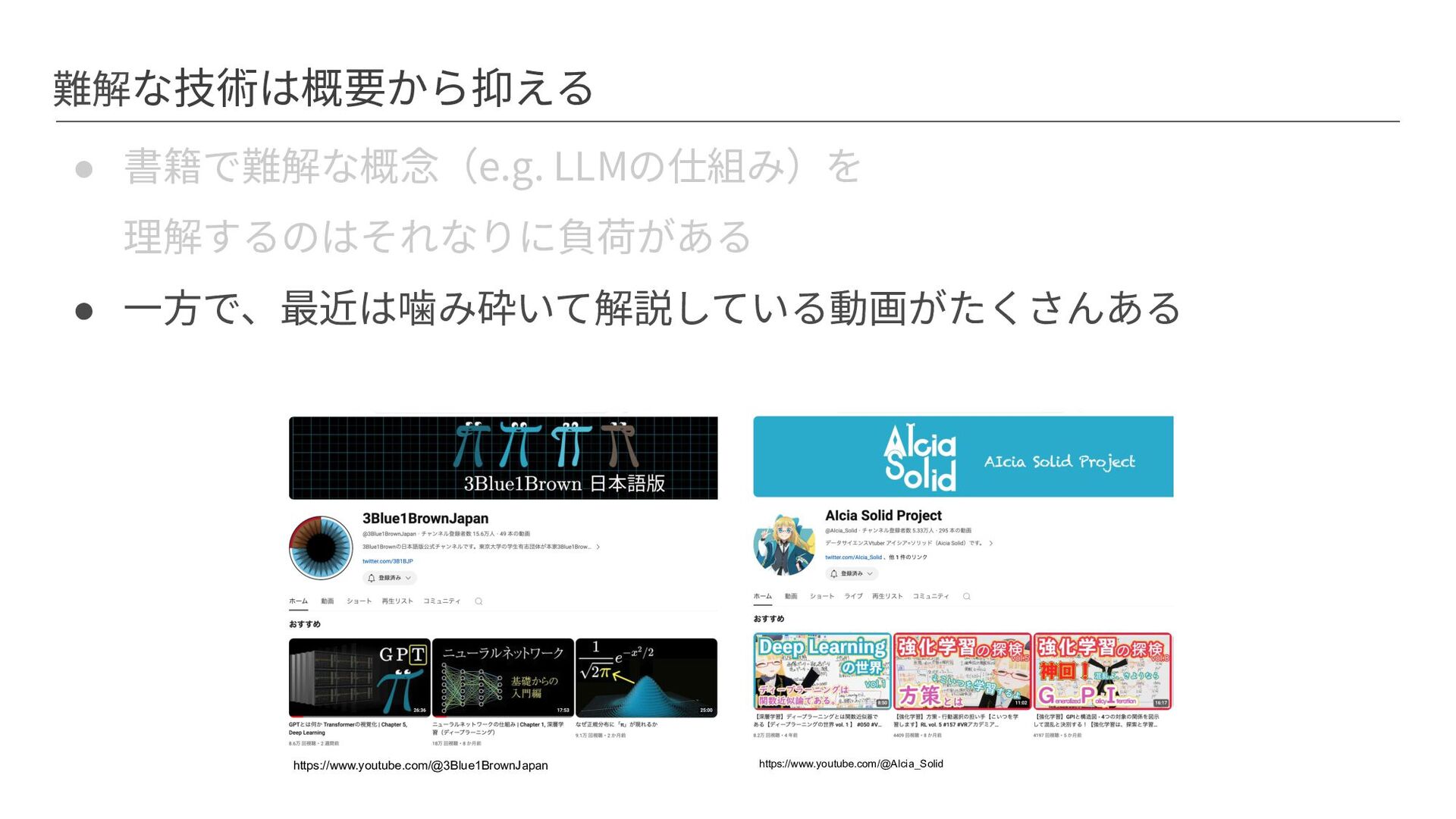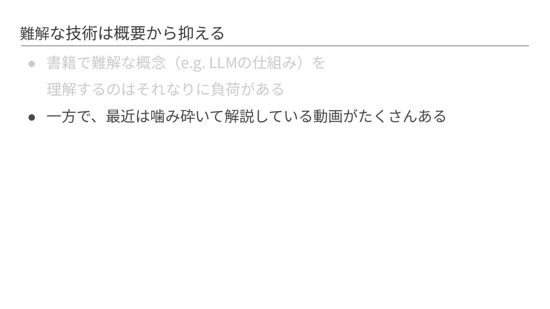 難解な技術は概要から抑える • 書籍で難解な概念(e.g. LLMの仕組み)を 理解するのはそれなりに負荷がある • ⼀⽅で、最近は噛み砕いて解説している動画がたくさんある