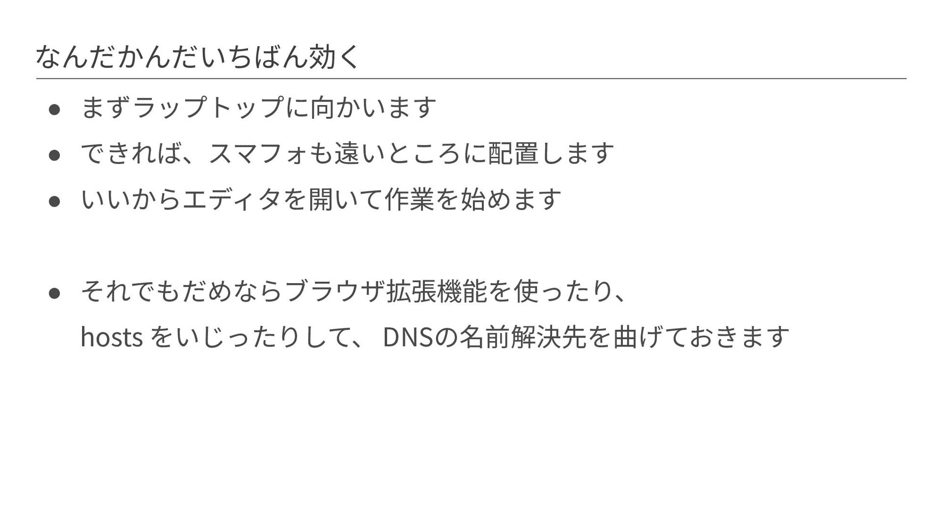 なんだかんだいちばん効く • まずラップトップに向かいます • できれば、スマフォも遠いところに配置します • いいからエディタを開いて作業を始めます • それでもだめならブラウザ拡張機能を使ったり、 hosts