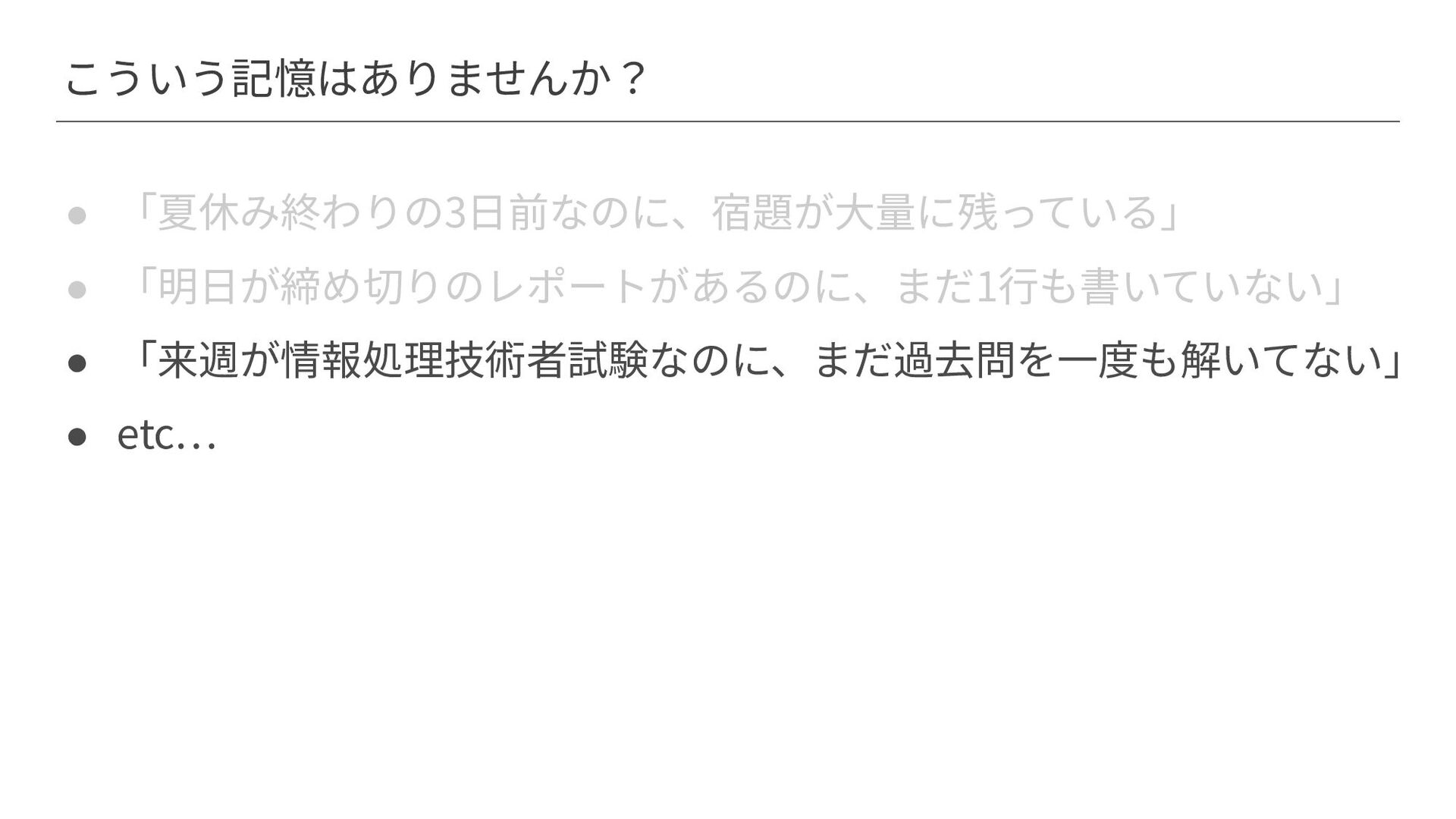 こういう記憶はありませんか? • 「夏休み終わりの3⽇前なのに、宿題が⼤量に残っている」 • 「明⽇が締め切りのレポートがあるのに、まだ1⾏も書いていない」 • 「来週が情報処理技術者試験なのに、まだ過去問を⼀度も解いてない」 • etc…