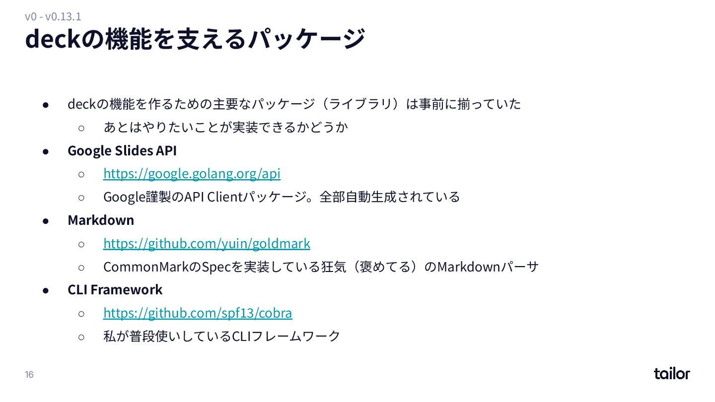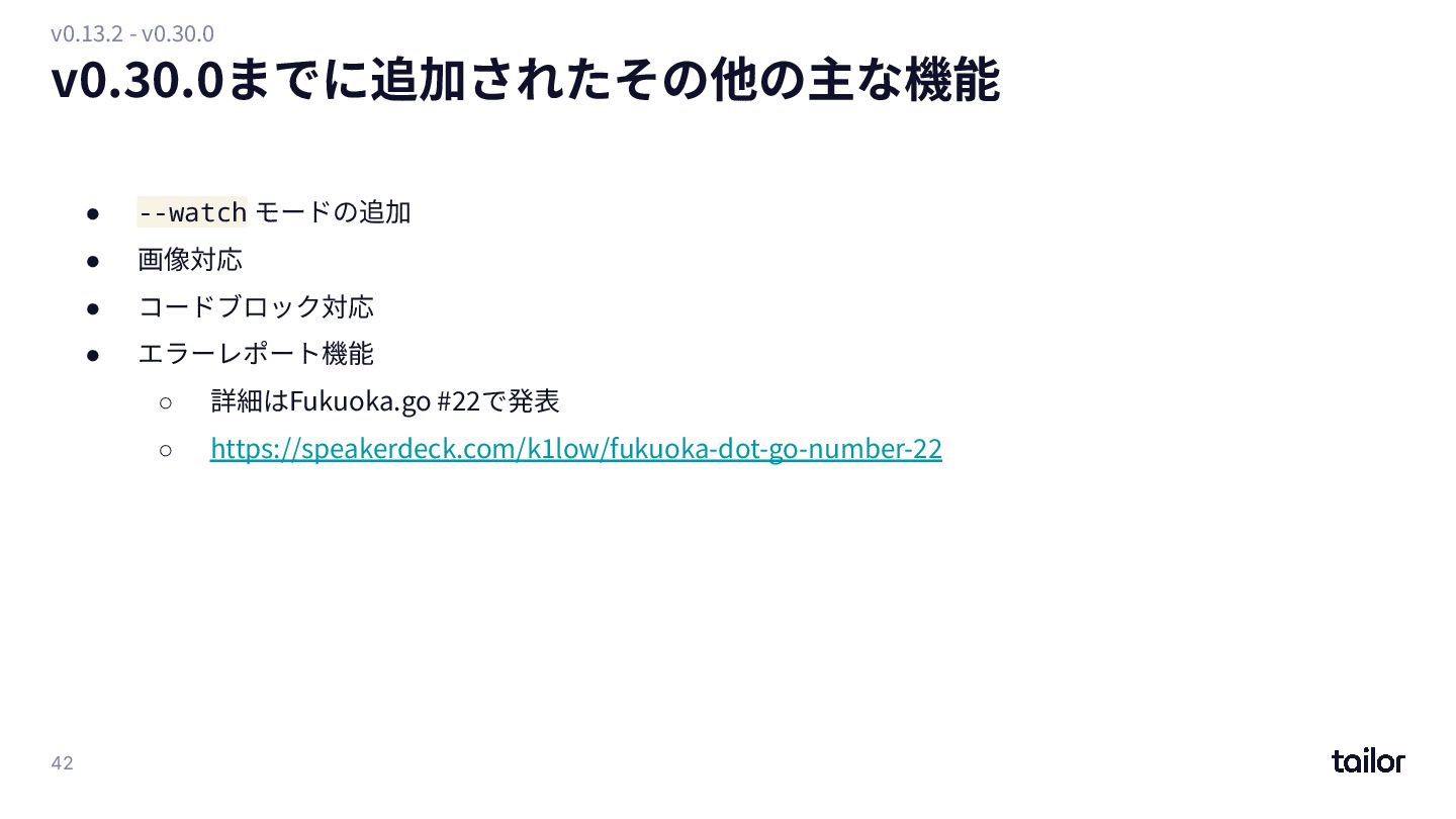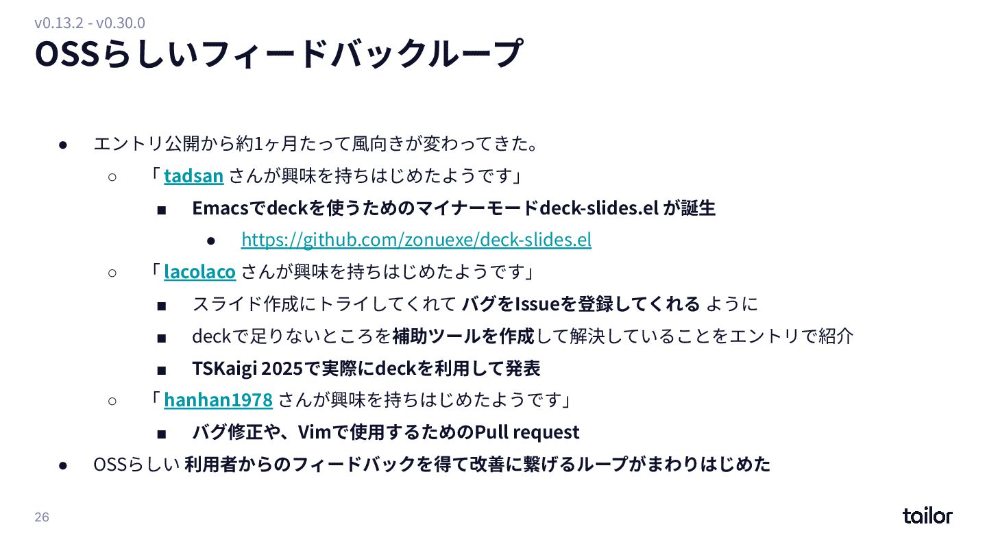 and Google Slides. ◦ https://github.com/k1LoW/deck ◦ 2025/11/08時点で現在 v1.21.6 ◦ 929 Star • いくつかの課題はあるが開発⾃体は落ち着いている • 2つのKey conceptは依然としてそのまま ◦ もう⼤きな機能追加はないと思う(N回⽬) • 今後 ◦ まだ海外へのPRをしていないので、そこに⼿をつけたら(もしかしたら)もう少し今までのような エキサイティングOSS活動を楽しめるかもしれない ◦ 「よく知られた枯れたツール」を⽬指したい v1 - 53
