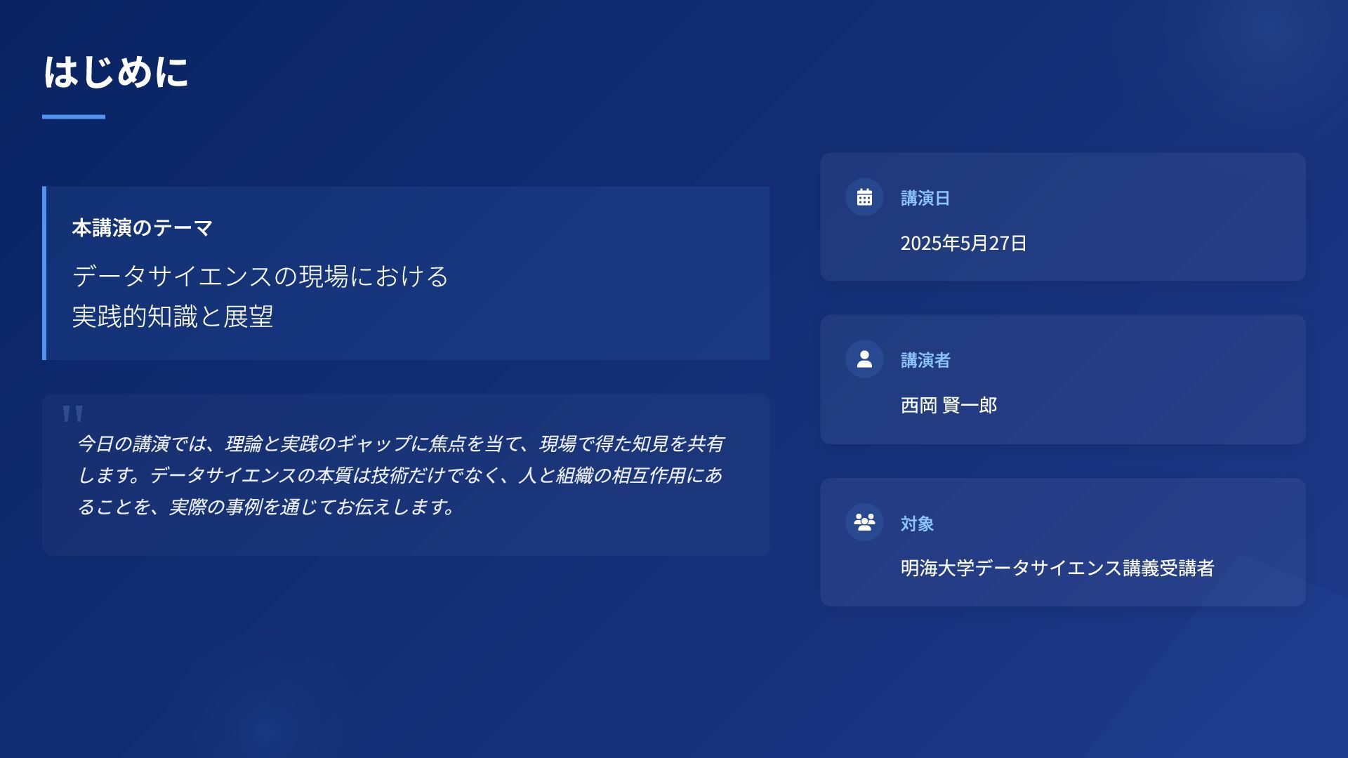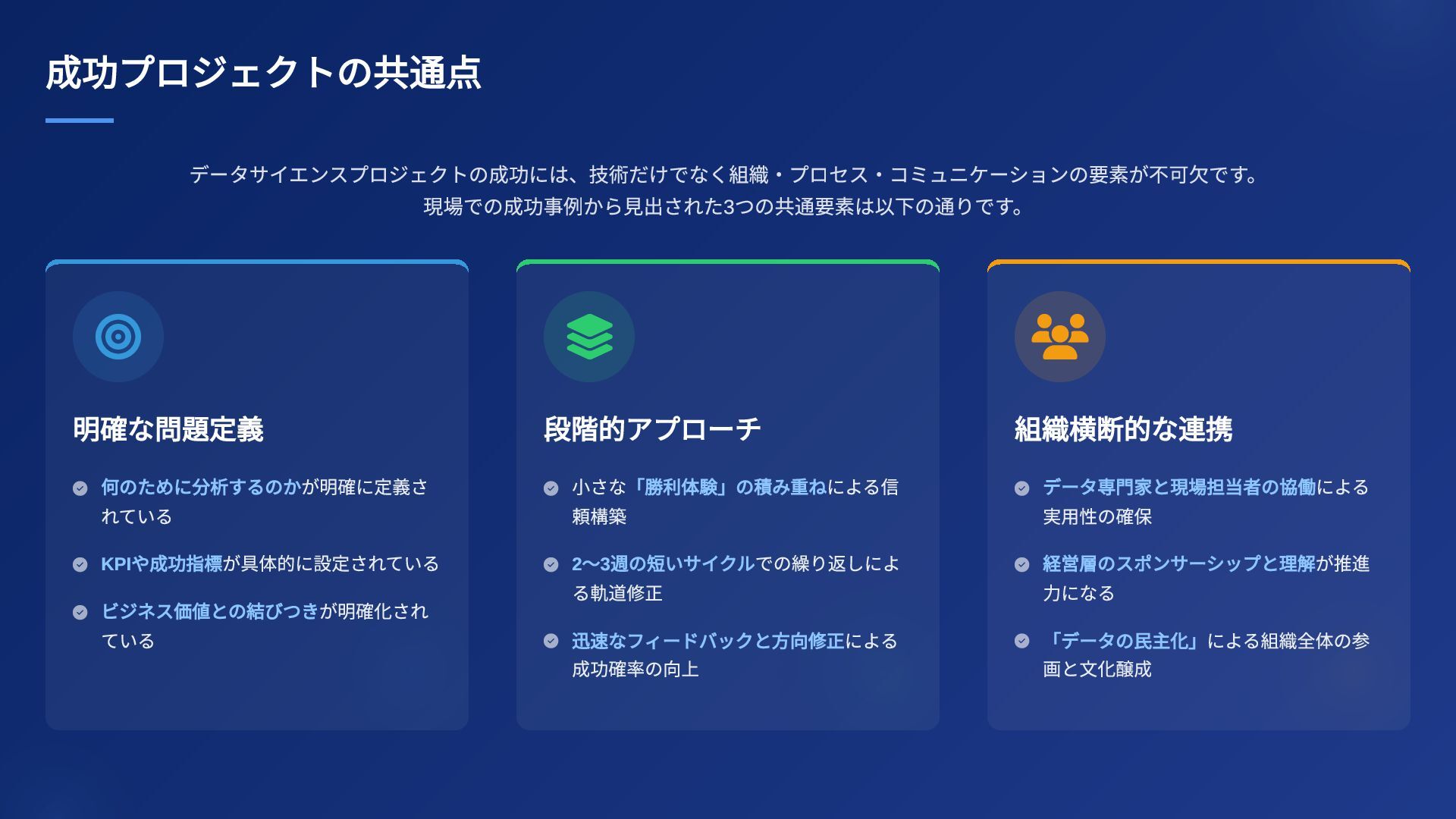 の廃止により個人に紐づいた行動ログの取得が困難に。 問題点 会社の方針で「AI を使いたい」という、手段が目的化した状況。 データの断片性と紐付け不可能性という根本的制約を無視。 複雑なモデルを作ることに固執し、そもそもデータの質についての検証が不十分。 結果 モデル精度が低いだけでなく、予測できたとしても個々のユーザーに適用できず。 技術的に複雑なソリューションを構築したが実用価値ゼロという結果に。 多大な開発リソースと時間を浪費し、データチームへの信頼も低下。 教訓 「garbage in, garbage out 」の原則を肝に銘じること。 テクニカルな複雑さより「そもそもこのデータで何ができるのか」という基本的な問いを最優先に。 目的と手段を取り違えず、ビジネス価値を生む最も単純な解決策から検討する姿勢が重要。 Garbage In Garbage Out 非ログインユ ーザー Cookie 制限 断片化データ 成功例 ✅ 成功例:まず基本的なログイン促進施策から始め、段階的にデータを蓄積してからAI モデルを構築した企業で は、コンバージョンを向上させる施策を実現。