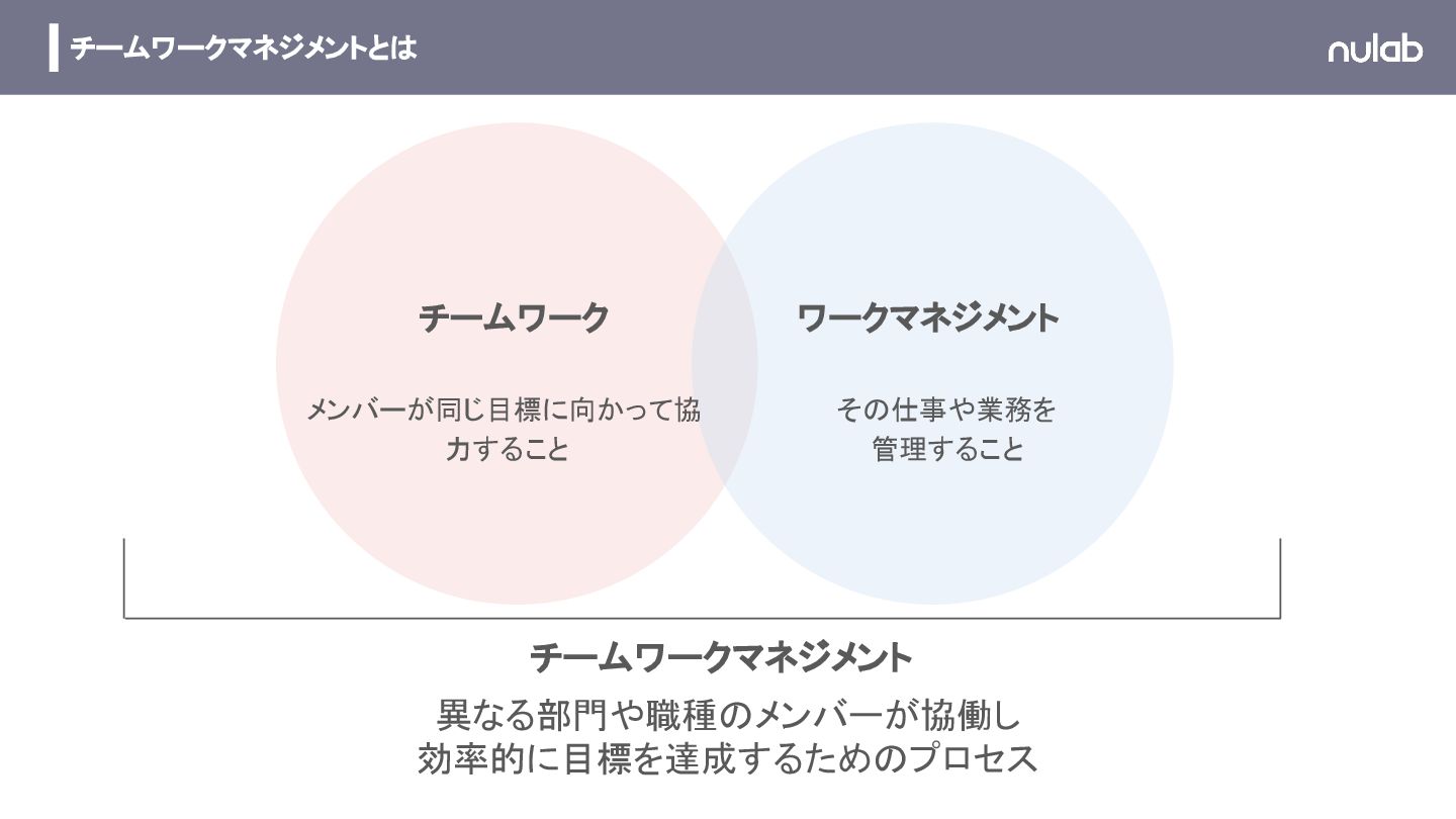 チームワーク ワークマネジメント チームワークマネジメント 異なる部門や職種のメンバーが協働し 効率的に目標を達成するためのプロセス メンバーが同じ目標に向かって協 力すること その仕事や業務を 管理すること チームワークマネジメントとは