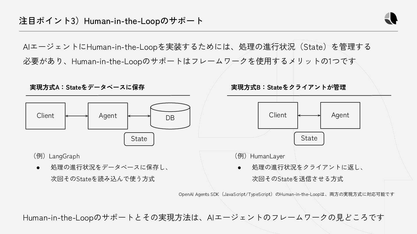 実行時の柔軟性は低いが安定的に動作しやすい (例)AutoGen、CrewAI、OpenAI Agents SDK • フレームワークが提供する機能を設定した エージェントを簡単に実装できる • モデルの判断で処理が進むため、 実行時の柔軟性は高いが安定的に動作しにくい 最近は両方の実装をサポートしているフレームワークも多いです (たとえば、CrewAIはCrewAI Flowsとしてワークフロー型のような実装をサポート、LangGraphはPrebuilt Agentsとしてエージェント型のような実装をサポート) agent = Agent( name="Assistant", instructions="You are a helpful assistant.", model="gpt-4.1", tools=[web_search], ) https://blog.langchai n.dev/code-execution -with-langgraph/