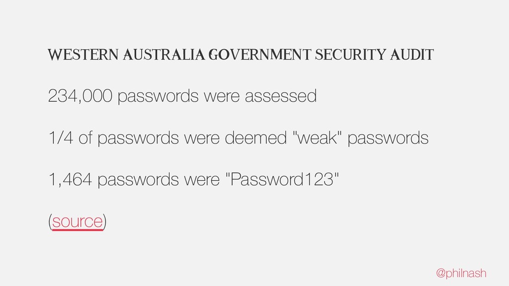 1,464 Western Australian government officials used ‘Password123’ as their password. Cool, cool: https://www.washingtonpost.com/technology/2018/08/22/western-australian-government-officials-used-password-their-password-cool-cool/