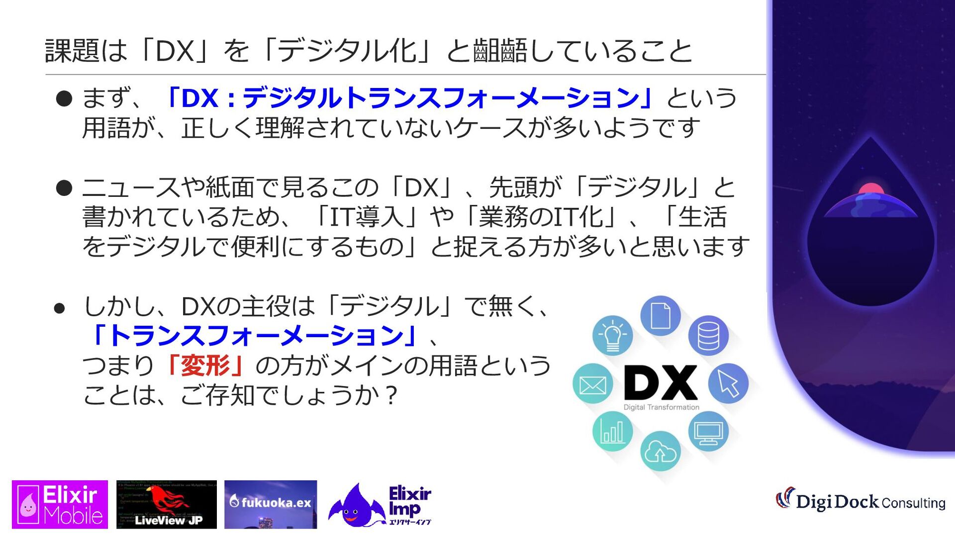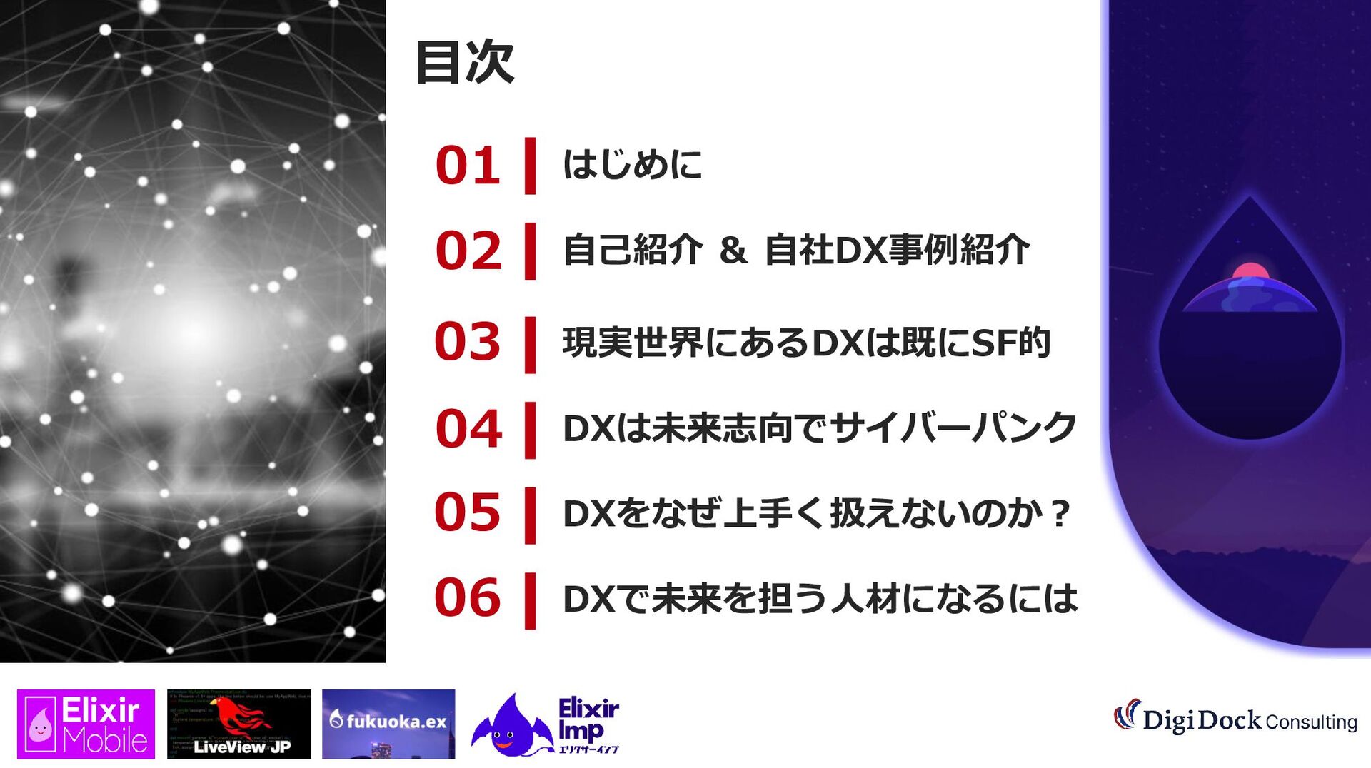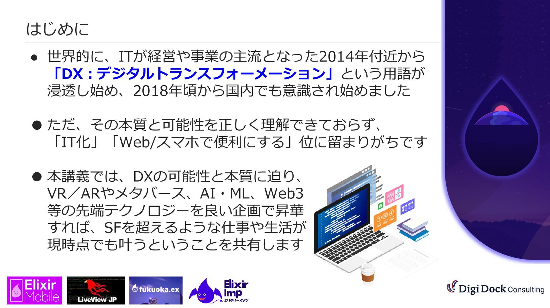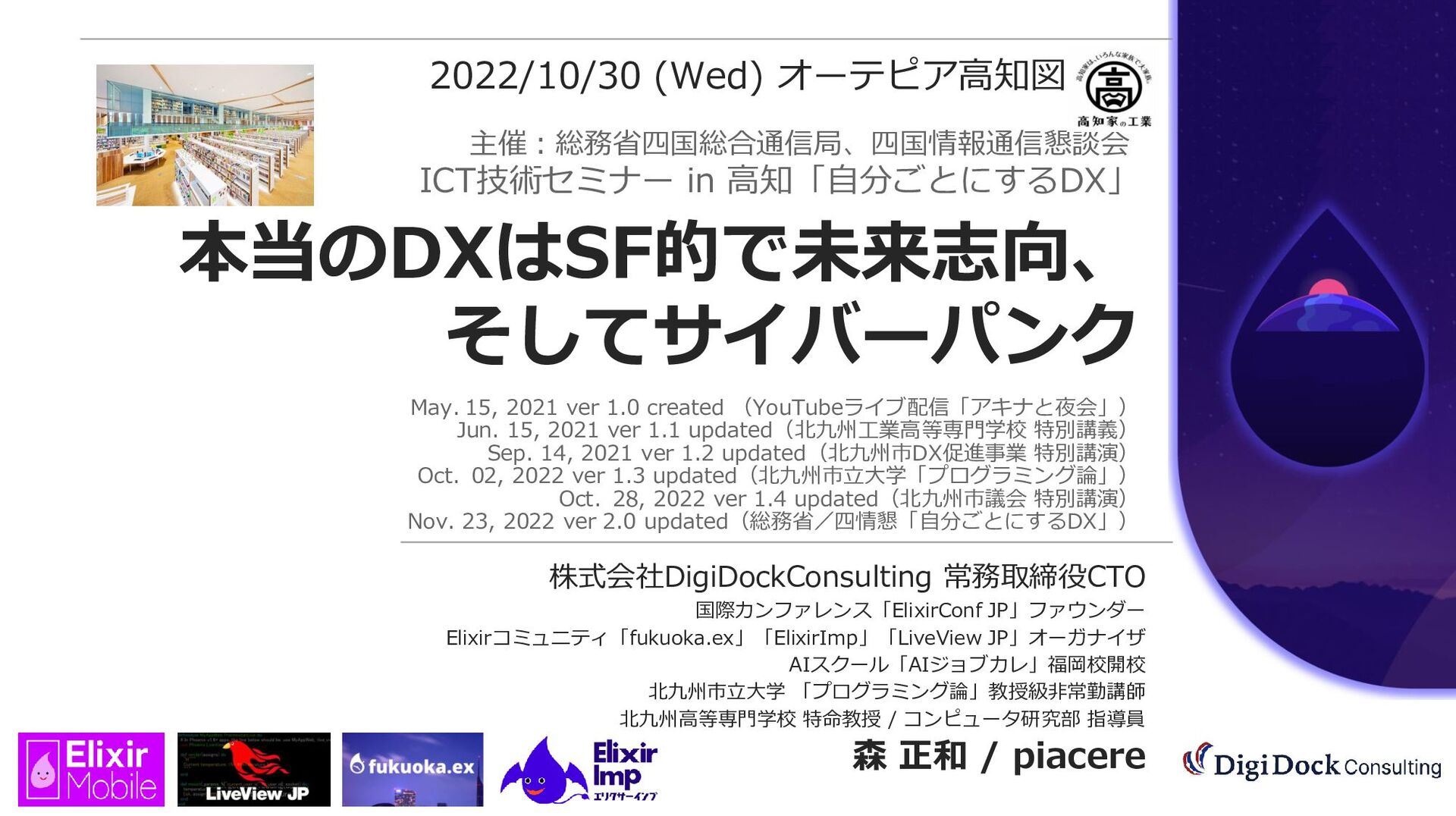 15, 2021 ver 1.0 created.(YouTubeライブ配信「アキナと夜会」) Jun. 15, 2021 ver 1.1 updated(北九州工業高等専門学校 特別講義) Sep. 14, 2021 ver 1.2 updated(北九州市DX促進事業 特別講演) Oct. 02, 2022 ver 1.3 updated(北九州市立大学「プログラミング論」) Oct. 28, 2022 ver 1.4 updated(北九州市議会 特別講演) Nov. 23, 2022 ver 2.0 updated(総務省/四情懇「自分ごとにするDX」) 株式会社DigiDockConsulting 常務取締役CTO 国際カンファレンス「ElixirConf JP」ファウンダー Elixirコミュニティ「fukuoka.ex」「ElixirImp」「LiveView JP」オーガナイザ AIスクール「AIジョブカレ」福岡校開校 北九州市立大学 「プログラミング論」教授級非常勤講師 北九州高等専門学校 特命教授 / コンピュータ研究部 指導員 森 正和 / piacere
