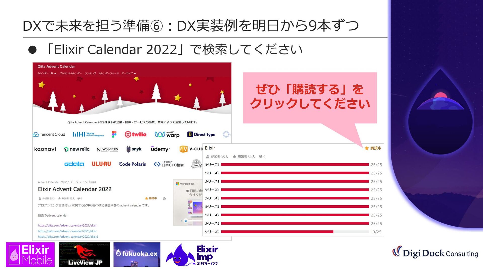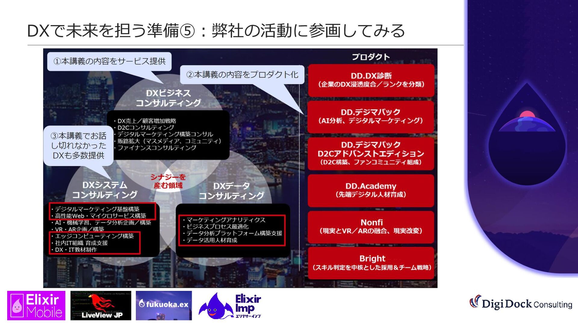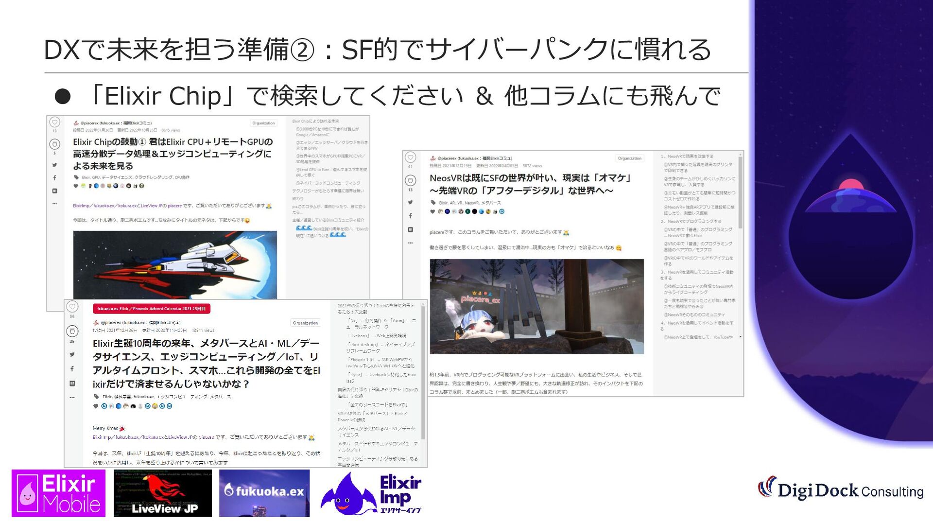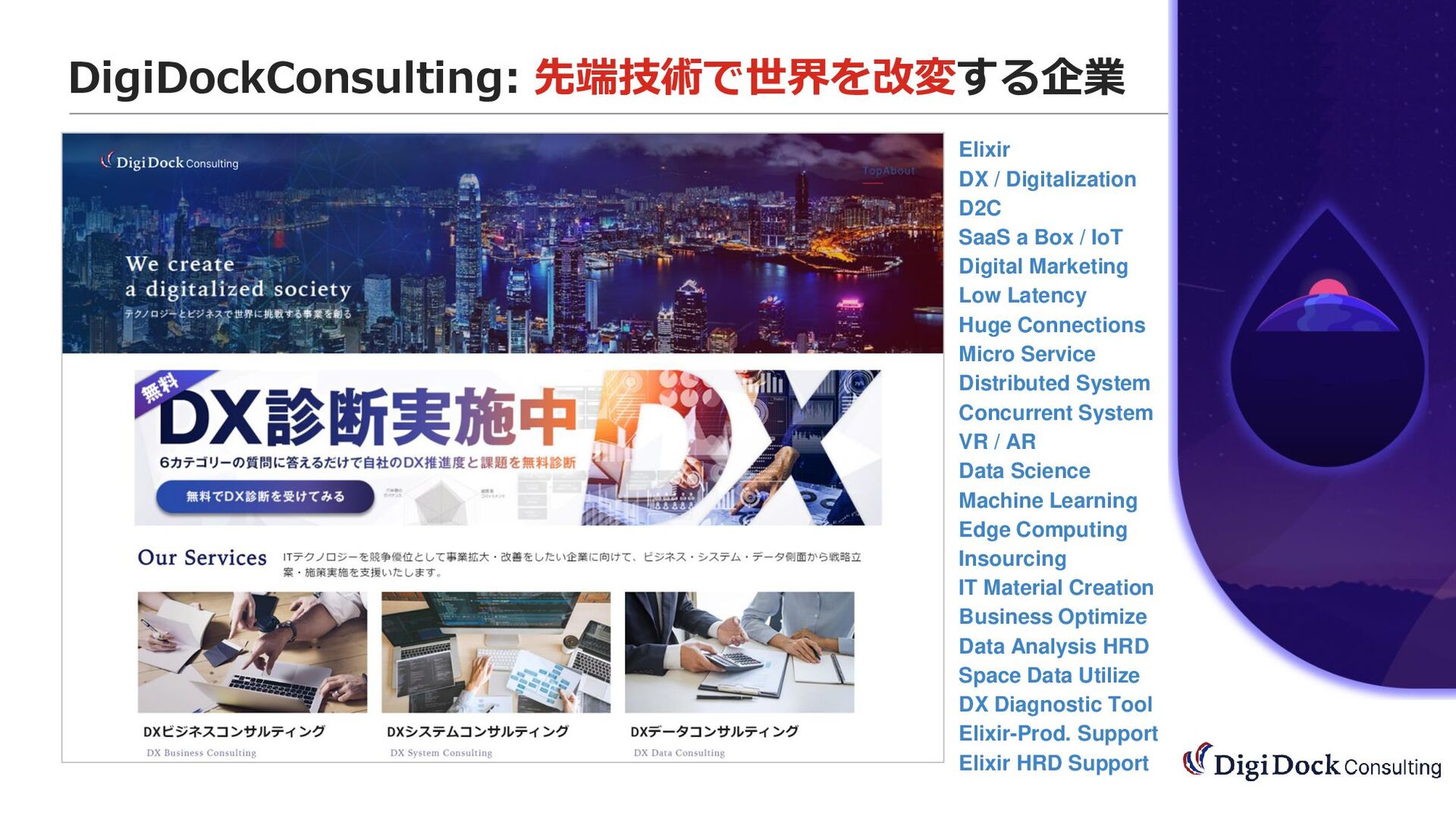 Digital Marketing Low Latency Huge Connections Micro Service Distributed System Concurrent System VR / AR Data Science Machine Learning Edge Computing Insourcing IT Material Creation Business Optimize Data Analysis HRD Space Data Utilize DX Diagnostic Tool Elixir-Prod. Support Elixir HRD Support DigiDockConsulting: 先端技術で世界を改変する企業