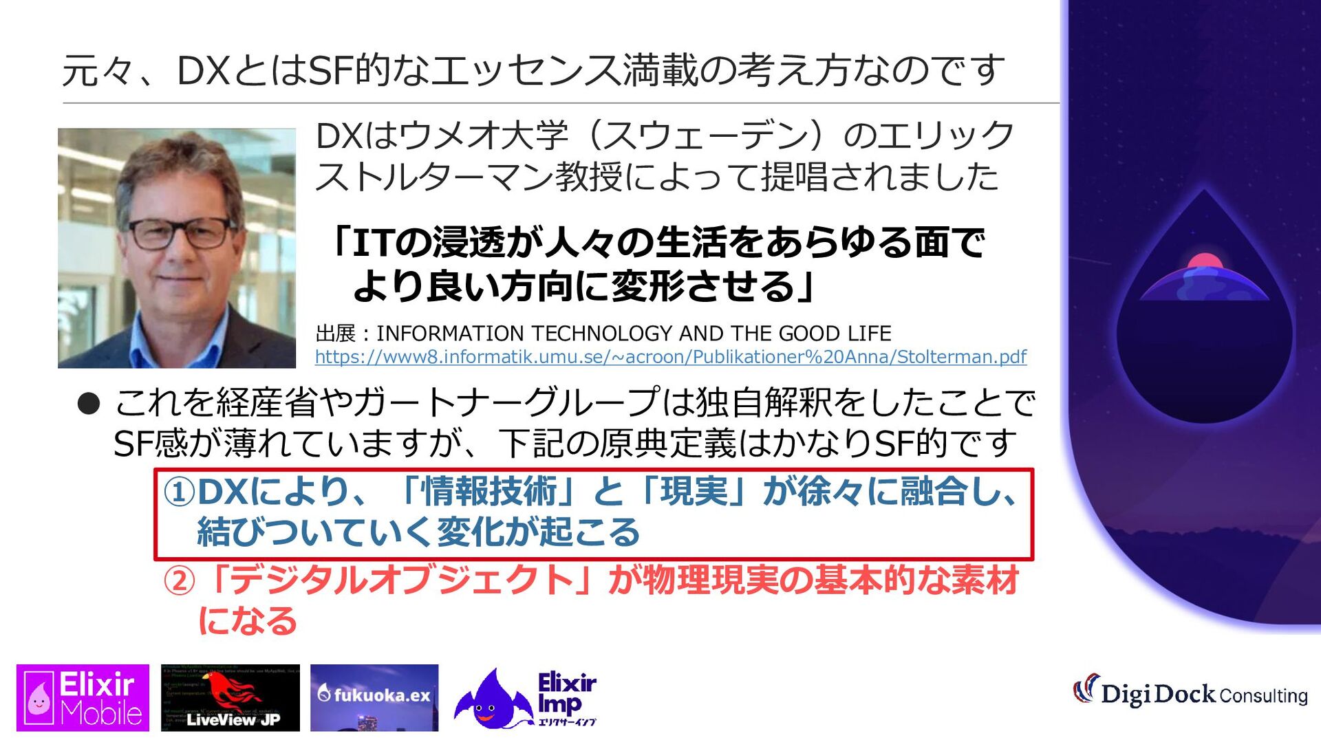 LIFE https://www8.informatik.umu.se/~acroon/Publikationer%20Anna/Stolterman.pdf • これを経産省やガートナーグループは独自解釈をしたことで SF感が薄れていますが、下記の原典定義はかなりSF的です ①DXにより、「情報技術」と「現実」が徐々に融合し、 結びついていく変化が起こる ②「デジタルオブジェクト」が物理現実の基本的な素材 になる