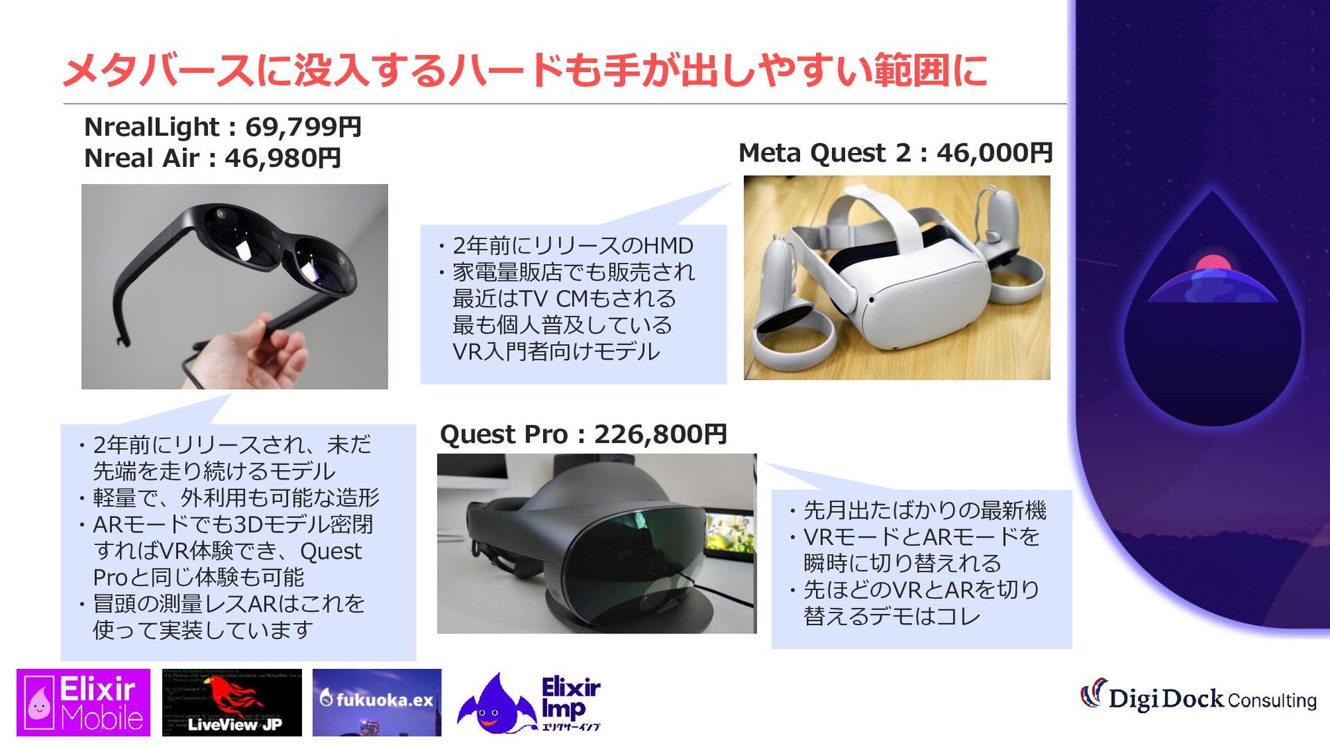 Nreal Air:46,980円 ・先月出たばかりの最新機 ・VRモードとARモードを 瞬時に切り替えれる ・先ほどのVRとARを切り 替えるデモはコレ ・2年前にリリースのHMD ・家電量販店でも販売され 最近はTV CMもされる 最も個人普及している VR入門者向けモデル Quest Pro:226,800円 Meta Quest 2:46,000円