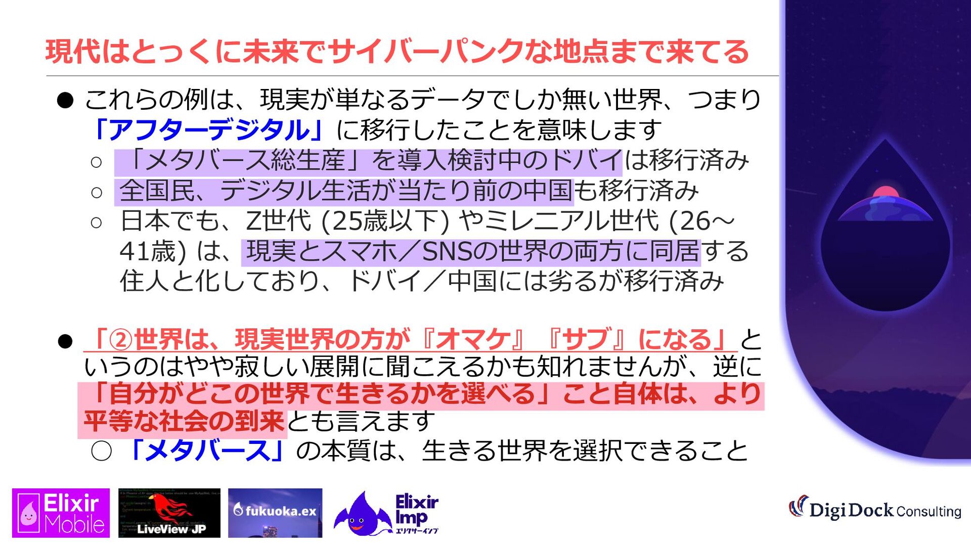 (25歳以下) やミレニアル世代 (26~ 41歳) は、現実とスマホ/SNSの世界の両方に同居する 住人と化しており、ドバイ/中国には劣るが移行済み • 「②世界は、現実世界の方が『オマケ』『サブ』になる」と いうのはやや寂しい展開に聞こえるかも知れませんが、逆に 「自分がどこの世界で生きるかを選べる」こと自体は、より 平等な社会の到来とも言えます ◦ 「メタバース」の本質は、生きる世界を選択できること