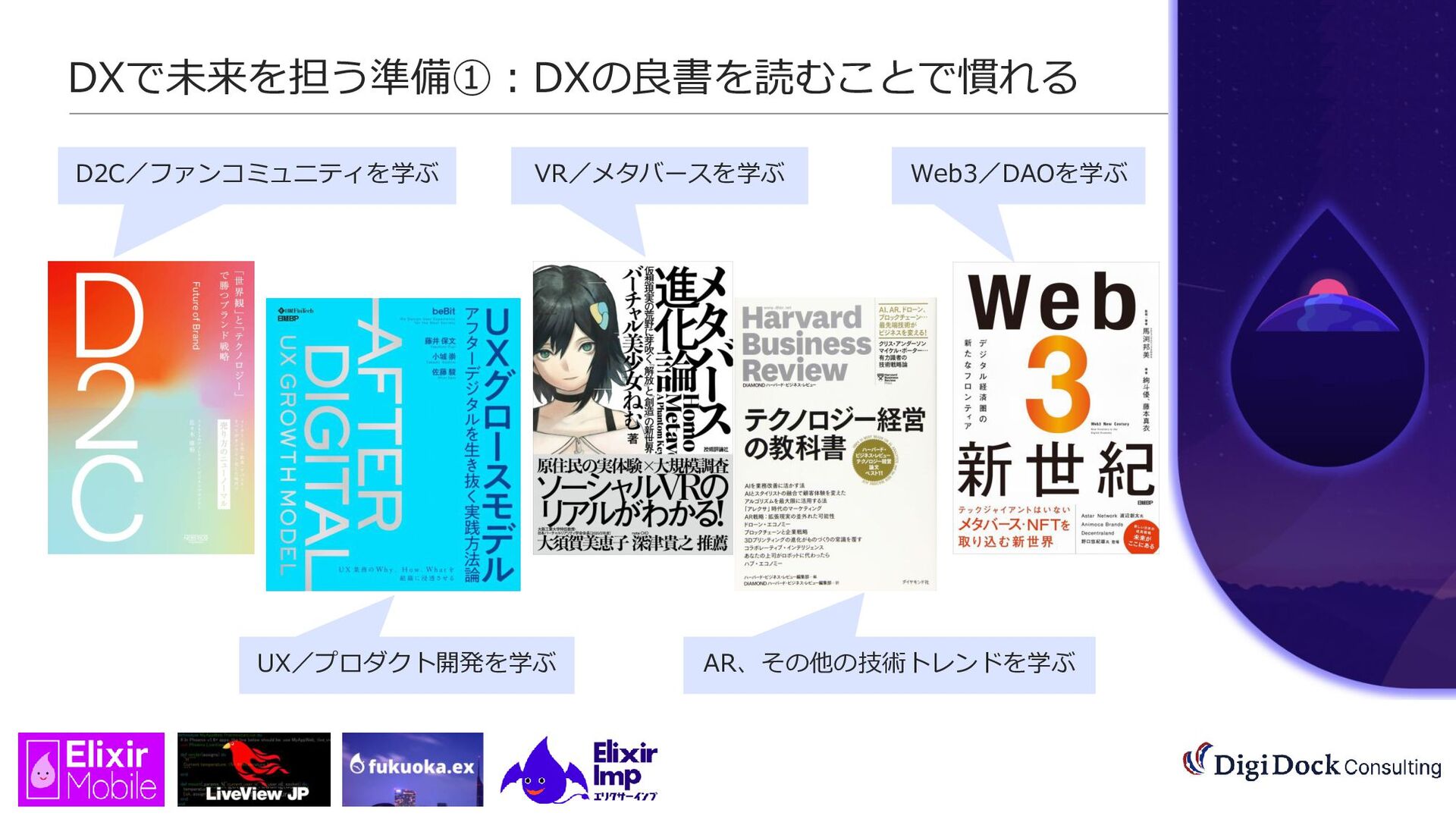 • DXをこれから学ぶ方向けの本としてオススメ • DXの原典定義は本講義と同じ記述があります • 一方で、本講義のメインテーマである、 「本当のDXはSF的で未来志向、そしてサイバ ーパンク」という観点は、この本で不足してお り、本講義にて補完されます