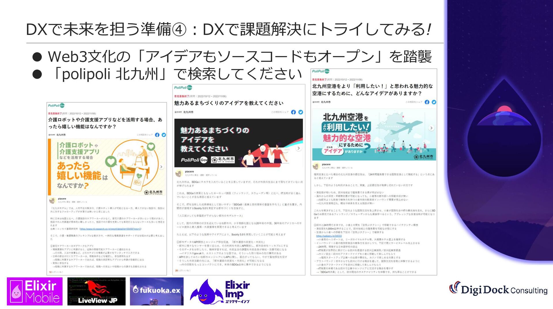 ・エンジニア数世界4位 3. サステイナー ・市民が市民を支える ・若者に教えられる年配 ・SDGs 高齢化の先行性 人口減少の先行性 他都市より先回り ◎高齢者特化の行動 センサ+ARグラス 観光 ◎徘徊高齢者向けの 屋内外GIS捕捉 ◎VR内業+AR現場 製造/土木/建設等 ◎屋内AR施設案内 ◎NFT特区の成立 (福岡市も制定中) ◎DAOの法人化 (ワイオミング州が先行) ◎遠隔VR移住体験 ◎居宅ケアワーカー のギグワーク化 ◎VR/ARによるケア ワーカー遠隔訓練 ◎IT企業とフリーラ ンスのためのVR オフィス誘致 ◎世界進出可能企業 のDX積極支援 ◎メタバース x アニメ ◎測量レスAR土木 ◎高齢有識者による 教育YouTuber輩出 ◎音声AI介護による 高齢者雇用に特化 した企業運営の確立 ◎市民向けサービス を市民自身が行う (イギリスgov.ukが先行) ◎ビル管理システム (BIM) のVR/AR化 (現在、国内大手と協業) ◎SDG9 = Socirty 5.0を都市で実証 (都市センサNW+API化) ◎市主催の年金破綻 世代向けESG投資 ワークショップ 北九州市魏会向け DX講義スライドより