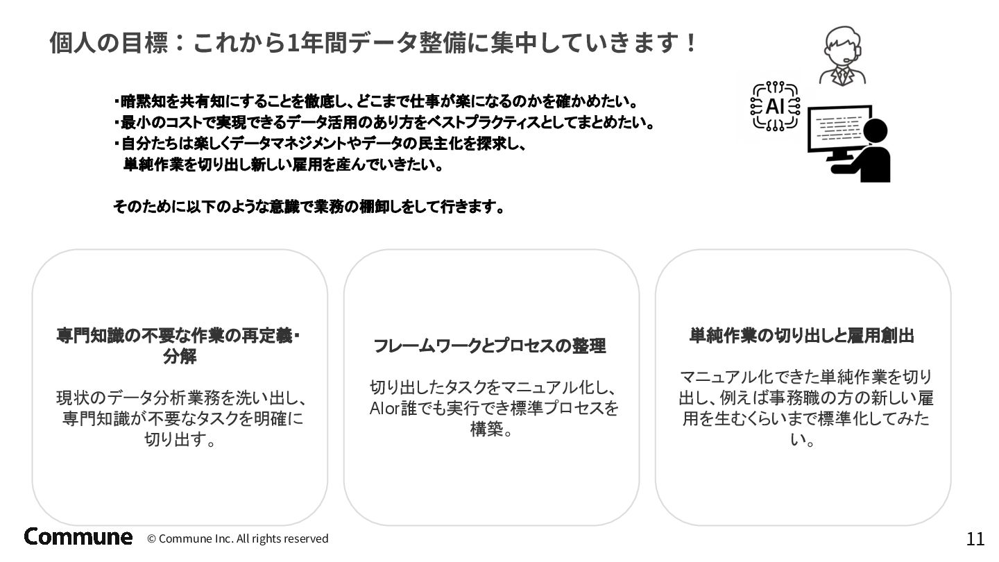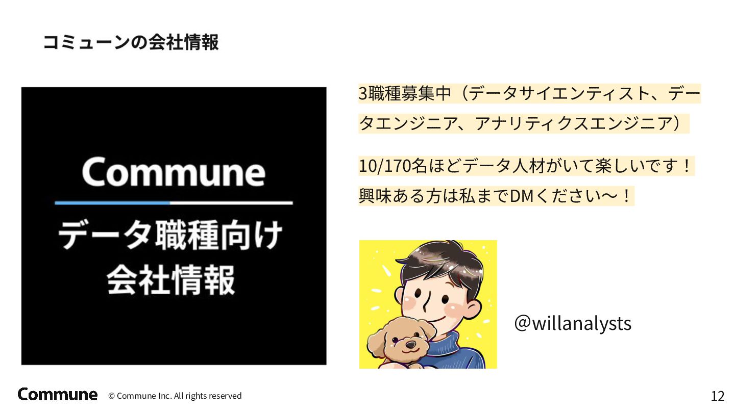 © Commune Inc. All rights reserved 個⼈の⽬標:これから1年間データ整備に集中していきます! 11 ・暗黙知を共有知にすることを徹底し、どこまで仕事が楽になるのかを確かめたい。 ・最小のコストで実現できるデータ活用のあり方をベストプラクティスとしてまとめたい。