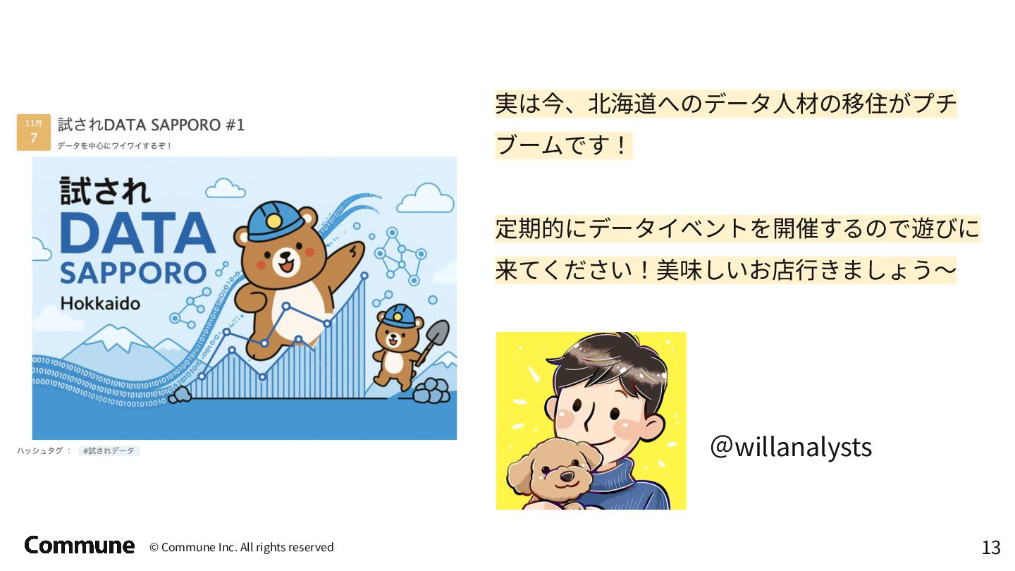 © Commune Inc. All rights reserved 13 実は今、北海道へのデータ⼈材の移住がプチ ブームです! 定期的にデータイベントを開催するので遊びに