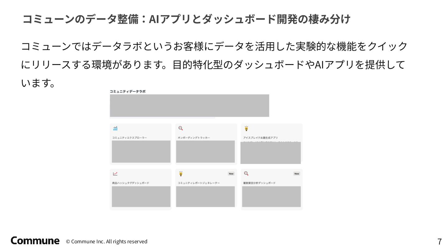 © Commune Inc. All rights reserved コミューンのデータ整備:AIアプリとダッシュボード開発の棲み分け 7 コミューンではデータラボというお客様にデータを活⽤した実験的な機能をクイック にリリースする環境があります。⽬的特化型のダッシュボードやAIアプリを提供して