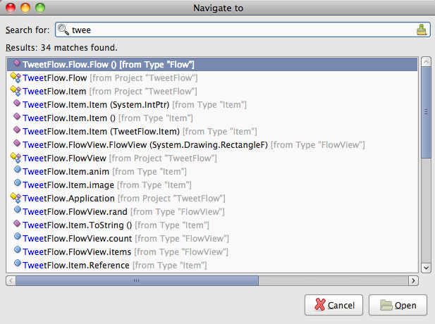 Perhaps my favorite feature in MonoDevelop 2.4 is the "Navigate To" functionality that we added. This new feature is hooked to Control-comma on Linux and Windows and to Command-. on Mac.