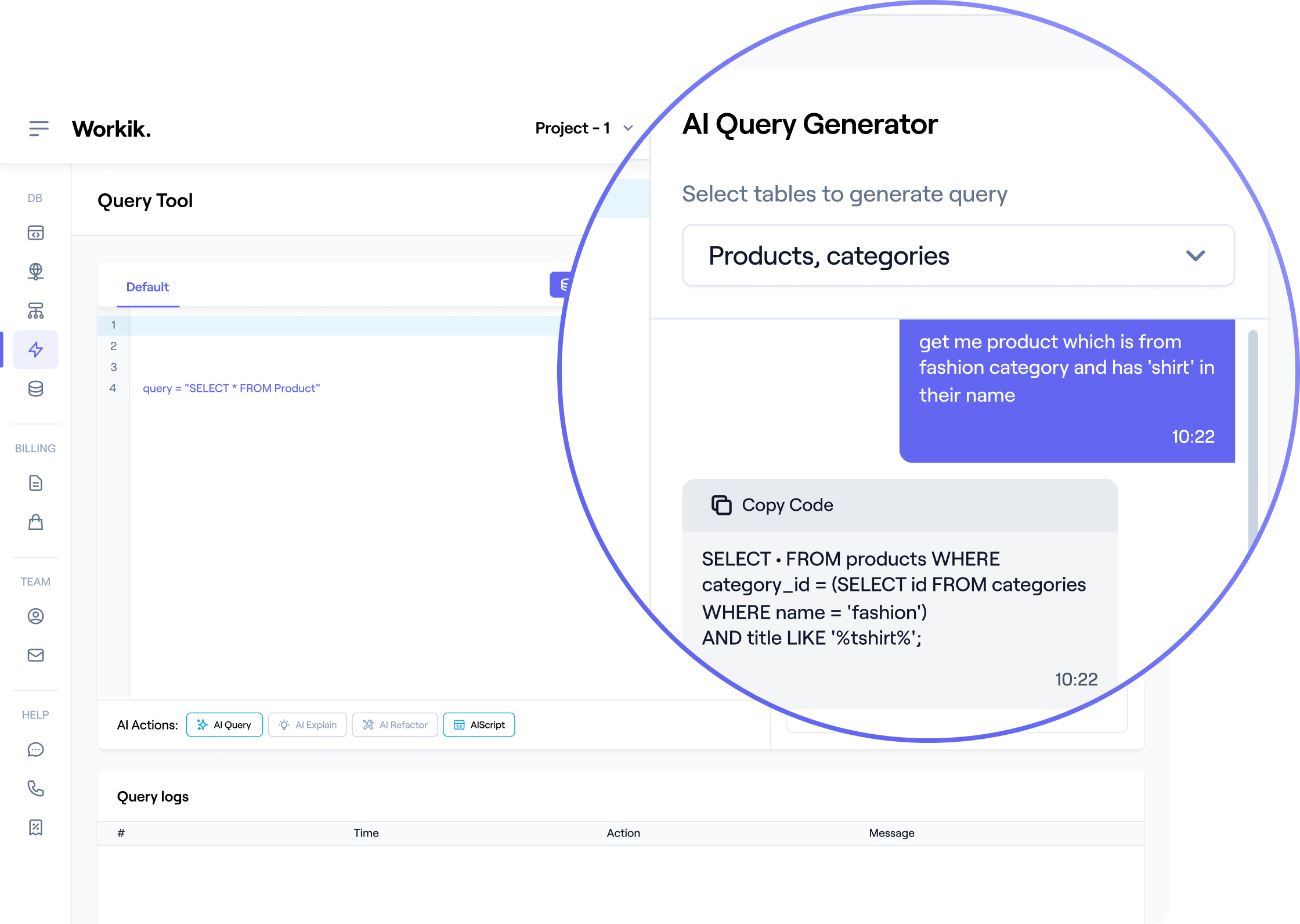 Use AI to generate, refactor, and explain queries. Share queries with the team using Workspaces.