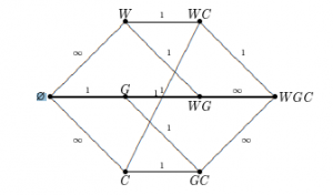 This problem can be solved using graph theory . Consider 2 states: initial (A) and final (B). Initially, the right side of the river has nothing on it and the goat, cabbage, and wolf are on the left. And in the final state, all three (goat, cabbage, and wolf) will be on the right side. How can we reach state B from state A? The right bank can have these combinations of goat(G), cabbage(C), wolf(W). -> 0, G, W, C, GW , GC , WC, GWC 0 represents the initial state (A) and GWC represents the final state(B). We can model this problem as an undirected weighted graph. Where each edge in the graph has weight 1 or infinite. This graph can be used to represent our problem.