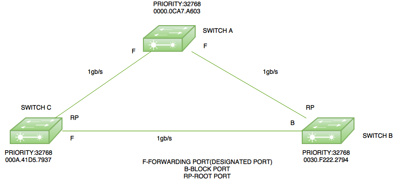 Here is a small topology with three switches switch A (mac address-0000.0ACA7.A603), switch B(0030.F222.2794), and switch C(000A.41D5.7937) with all having default priority (32768).